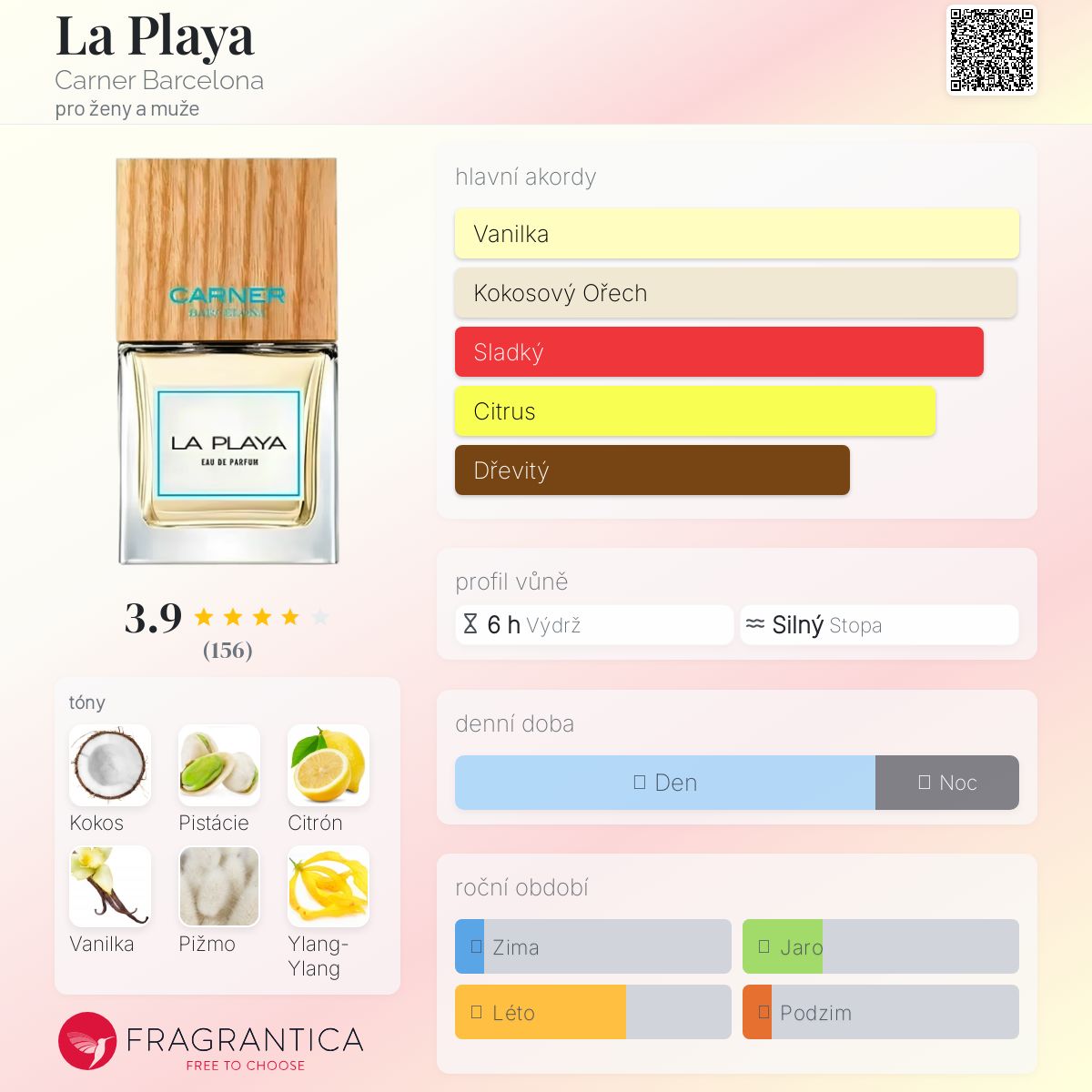 La Playa podle Carner Barcelona je Orientální Vanilla vůně pro ženy a muže. Toto je nová vůně. La Playa byl/a uveden/a v roce 2025. "Nosem" za touto vůní je Adriana Medina-Baez. Vrchní tóny jsou Citrón, Ylang-Ylang a Pomerančový květ; střední tóny jsouKokosové mléko, Pistácie a Kardamom ; základní tóny jsou Vanilka, Pižmo a Fazole tonka.