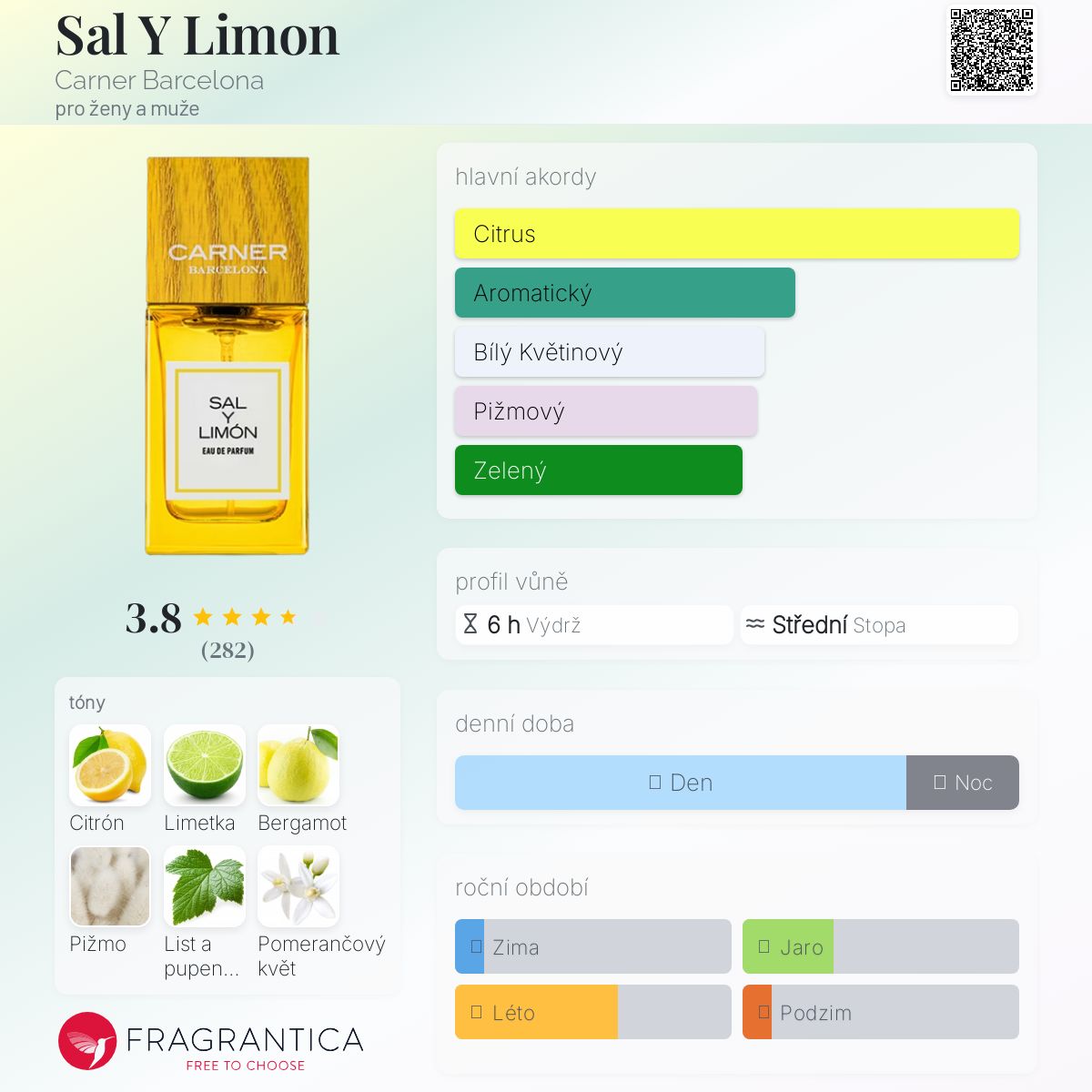 Sal Y Limon podle Carner Barcelona je vůně pro ženy a muže. Sal Y Limon byl/a uveden/a v roce 2022. Vrchní tóny jsou Italský citrón, Limetka a Bergamot; střední tóny jsouČerný rybíz, Pomerančový květ a Jasmín ; základní tóny jsou Pižmo, Jantar (ambra) a Pačuli.