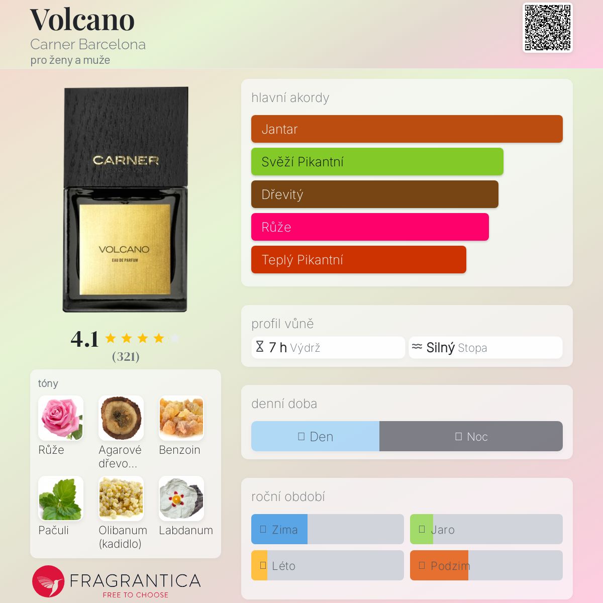 Volcano podle Carner Barcelona je vůně pro ženy a muže. Volcano byl/a uveden/a v roce 2018. Vrchní tóny jsou Bulharská růže, Zázvor a Indonéský muškátový oříšek; střední tóny jsouList indonéského pačuli, Olibanum a Cypriolový olej ; základní tóny jsou Agarové dřevo (oud), Siamský (thajský) benzoin, Španělské labdanum a Haitský vetiver.