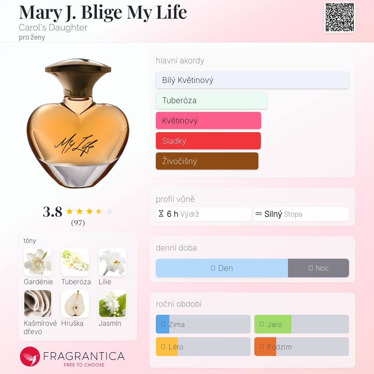 Mary J. Blige My Life podle Carol's Daughter je Floral Fruity Gourmand vůně pro ženy. Vrchní tóny jsou Gardénie, Hruška a Frézie; střední tóny jsouTuberóza, Lilie, Jasmín a Meruňkový květ ; základní tóny jsou Kašmírové dřevo, Sezam a Pralinka.