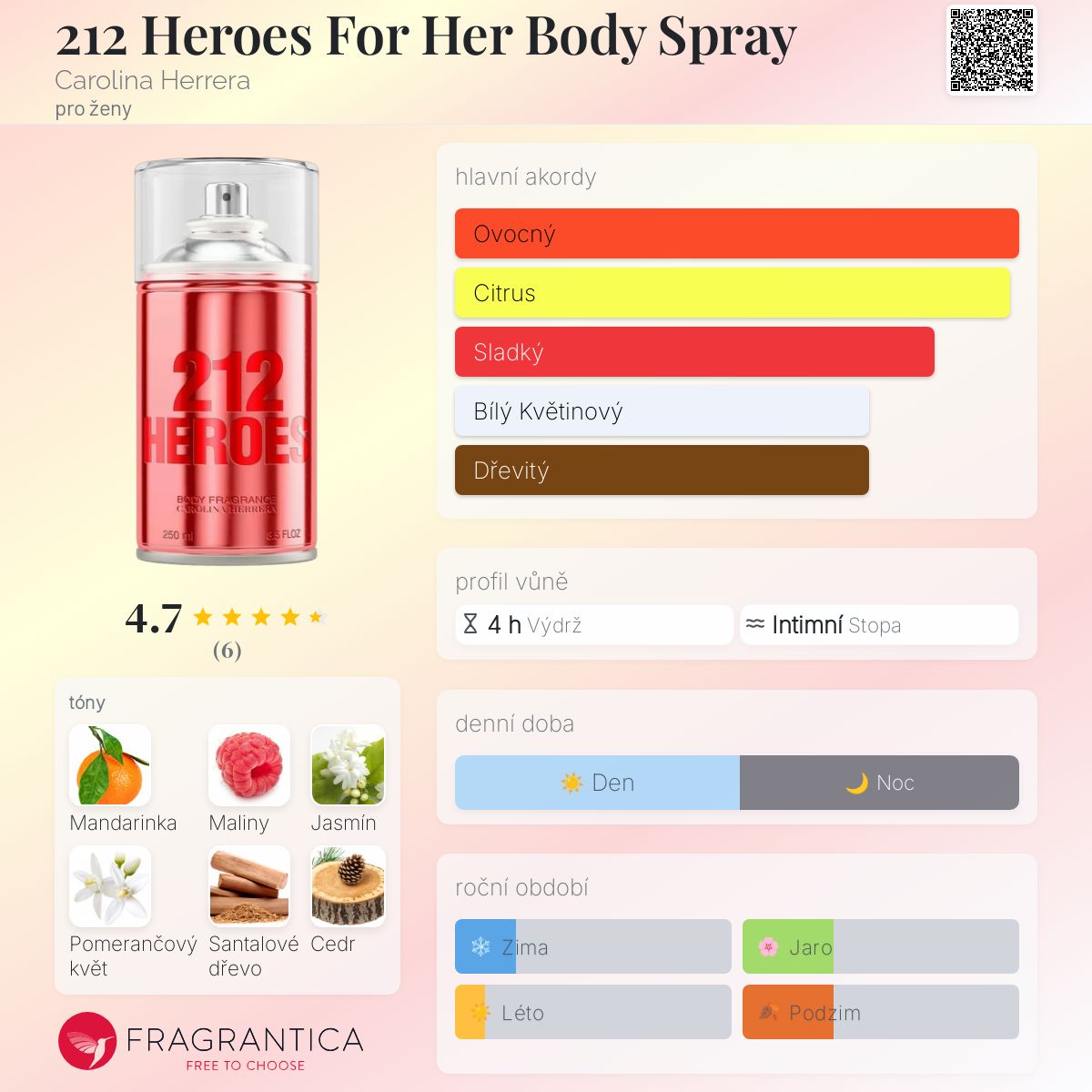 212 Heroes For Her Body Spray podle Carolina Herrera je Floral Fruity vůně pro ženy. 212 Heroes For Her Body Spray byl/a uveden/a v roce 2022. Vrchní tóny jsou Mandarinka a Maliny; střední tóny jsouJasmín a Pomerančový květ ; základní tóny jsou Santalové dřevo a Cedr.
