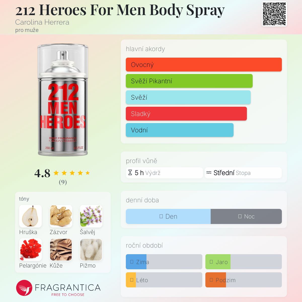 212 Heroes For Men Body Spray podle Carolina Herrera je Aromatic vůně pro muže. 212 Heroes For Men Body Spray byl/a uveden/a v roce 2021. Vrchní tóny jsou Hruška a Zázvor; střední tóny jsouŠalvěj a Pelargónie ; základní tóny jsou Kůže a Pižmo.