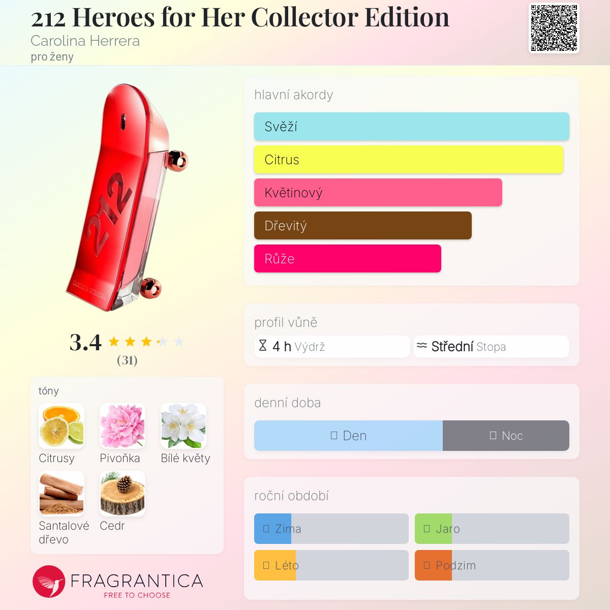 212 Heroes for Her Collector Edition podle Carolina Herrera je Floral Fruity vůně pro ženy. 212 Heroes for Her Collector Edition byl/a uveden/a v roce 2023. Vrchní tón je Citrusy ; střední tóny jsouPivoňka a Bílé květy ; základní tóny jsou Santalové dřevo a Cedr.