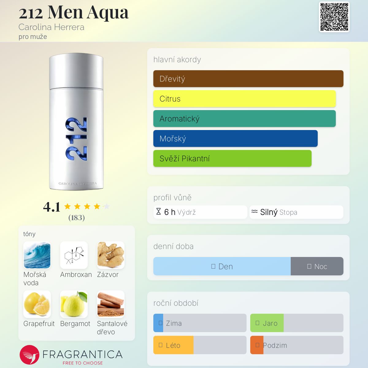 212 Men Aqua podle Carolina Herrera je Woody Aquatic vůně pro muže. 212 Men Aqua byl/a uveden/a v roce 2017. "Nosem" za touto vůní je Alberto Morillas. Vrchní tóny jsou Mořská voda, Zázvor, Grapefruit a Bergamot; střední tóny jsouAmbroxan, Gardénie, Kardamom a Cypriolový olej ; základní tóny jsou Santalové dřevo, Pačuli, Pižmo, Palisandr a Vetiver.