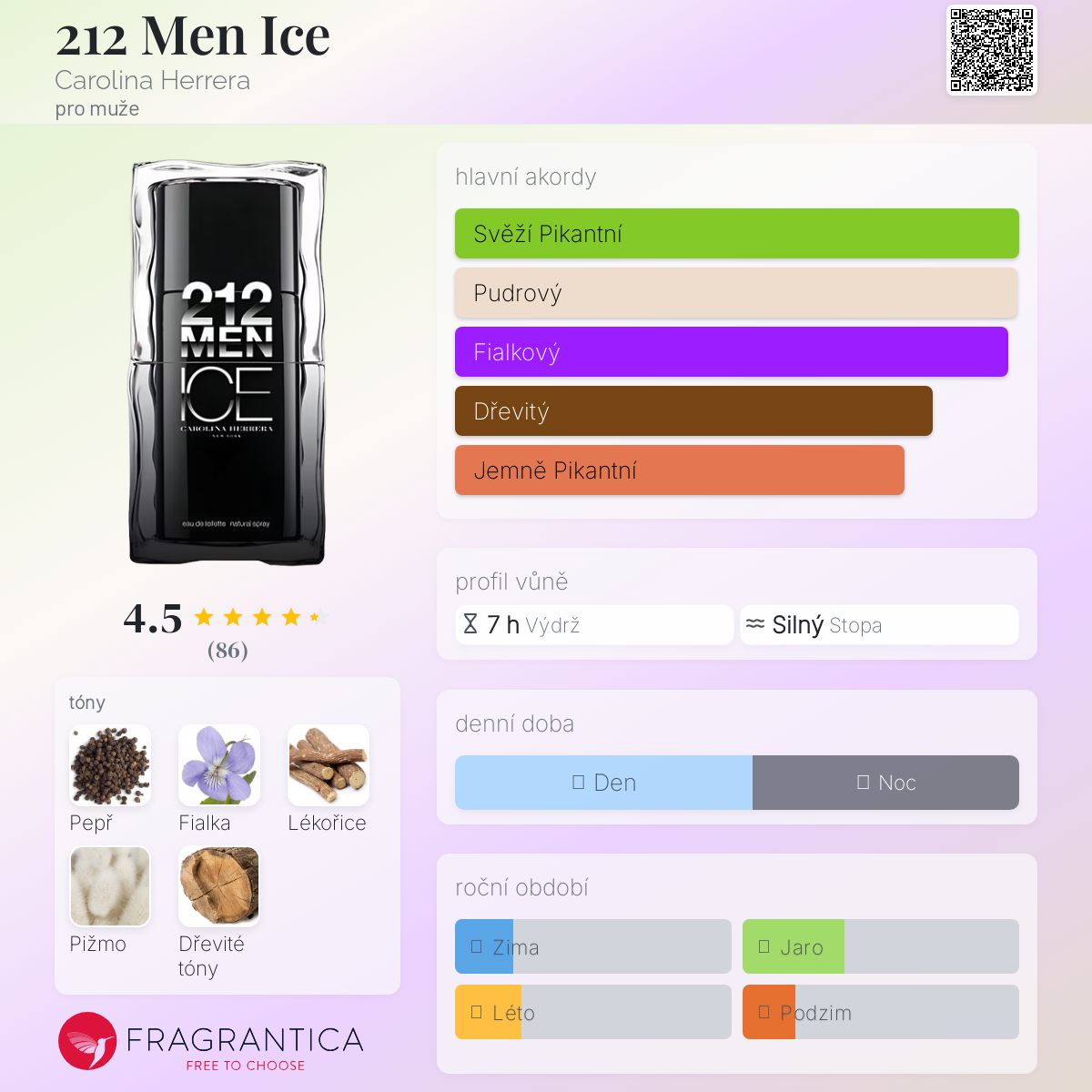 212 Men Ice podle Carolina Herrera je Woody Spicy vůně pro muže. 212 Men Ice byl/a uveden/a v roce 2010. Vrchní tóny jsou Pepř a Lékořice; střední tón jeFialka ; základní tóny jsou Pižmo a Dřevité tóny.