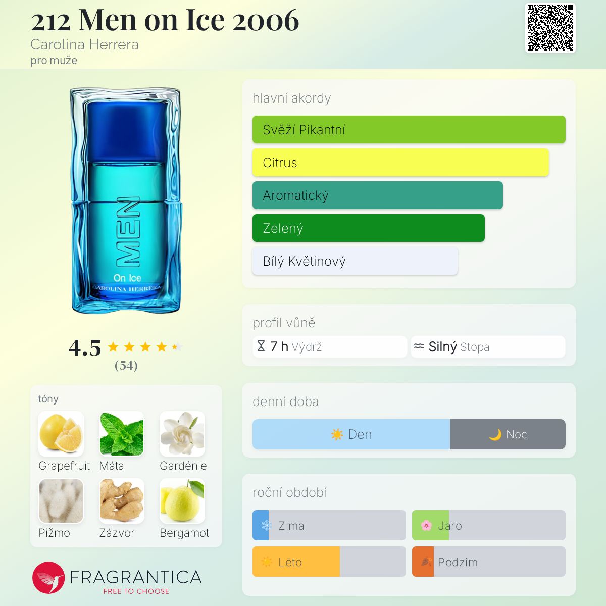 212 Men on Ice 2006 podle Carolina Herrera je Citrus Aromatic vůně pro muže. 212 Men on Ice 2006 byl/a uveden/a v roce 2006. Vrchní tóny jsou Grapefruit, Máta a Bergamot; střední tóny jsouGardénie, Zázvor, Muškátový oříšek a Kardamom ; základní tóny jsou Pižmo, Santalové dřevo a Kadidlo.