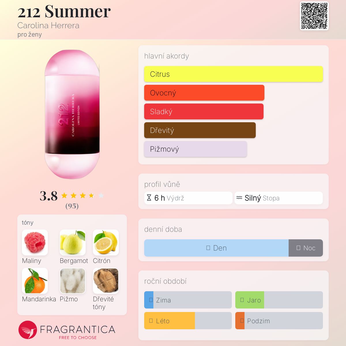 212 Summer podle Carolina Herrera je Floral Fruity vůně pro ženy. 212 Summer byl/a uveden/a v roce 2013. Vrchní tóny jsou Bergamot, Citrón a Mandarinka; střední tóny jsouMaliny, Ylang-Ylang a Jasmín ; základní tóny jsou Pižmo, Dřevité tóny, Šafrán a Jantar (ambra).