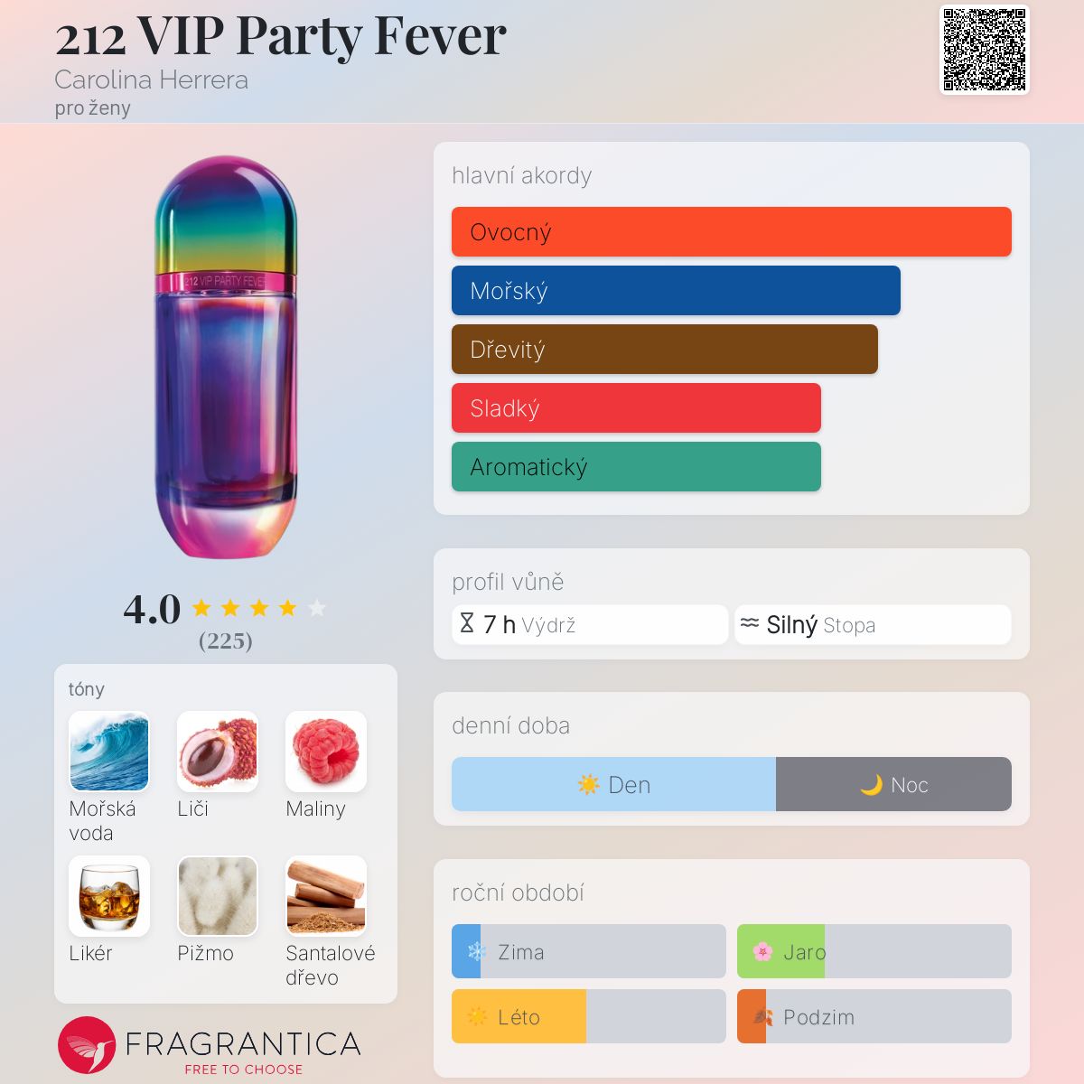 212 VIP Party Fever podle Carolina Herrera je Floral Fruity vůně pro ženy. 212 VIP Party Fever byl/a uveden/a v roce 2018. Vrchní tóny jsou Liči, Maliny a Likér; střední tóny jsouMořské tóny a Jasmín ; základní tóny jsou Pižmo, Santalové dřevo a Dřevité tóny.