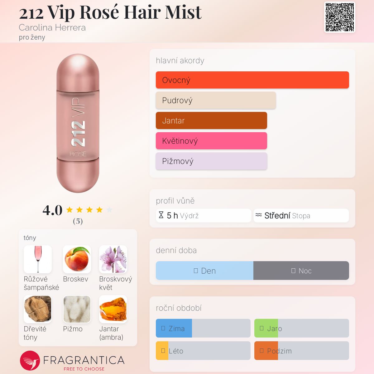 212 Vip Rosé Hair Mist podle Carolina Herrera je Floral Fruity vůně pro ženy. 212 Vip Rosé Hair Mist byl/a uveden/a v roce 2021. Vrchní tóny jsou Růžové šampaňské a Broskev; střední tón jeBroskvový květ ; základní tóny jsou Dřevité tóny, Bílé pižmo a Jantar (ambra).