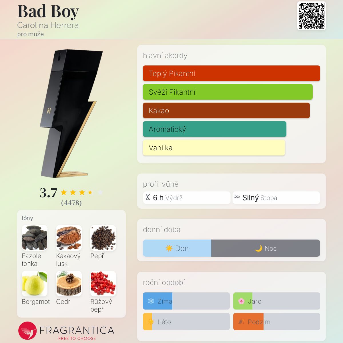 Bad Boy podle Carolina Herrera je Orientální Spicy vůně pro muže. Bad Boy byl/a uveden/a v roce 2019. Bad Boy byl/a vytvořen/a Quentin Bisch a Louise Turner. Vrchní tóny jsou Bílý pepř, Bergamot a Růžový pepř; střední tóny jsouCedr a Šalvěj muškátová ; základní tóny jsou Fazole tonka a Kakao.