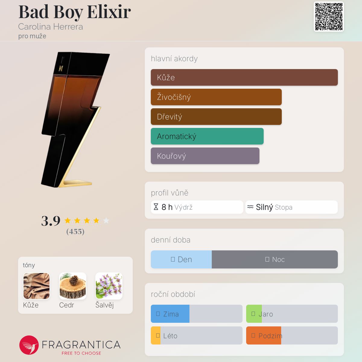 Bad Boy Elixir podle Carolina Herrera je Orientální Woody vůně pro muže. Toto je nová vůně. Bad Boy Elixir byl/a uveden/a v roce 2025. Vrchní tón je Šalvěj ; střední tón jeKůže ; základní tón je Cedr.