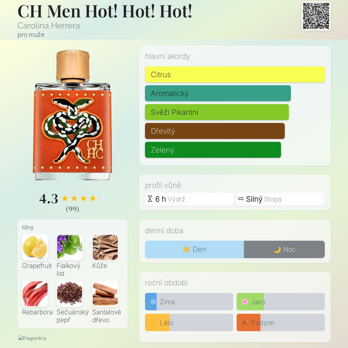 Velmi snadné, jednoduché, pohodlné a všestranné! Velmi připomíná původní CH Men, ale s nádechem, který je ideální pro nošení v horkém brazilském podnebí. V úvodu jsou tóny kombinovány tak, aby vůně nebyla ani příliš citrusová, ani příliš hořká. Poté přichází pepř, který do parfému vnáší kořeněný aspekt, spolu s kombinací kůže+vetiver+sandalové dřevo charakteristickou pro původní vůni. Je to CH Men jako stvořený pro tropické podnebí! Není tak sladká jako originál, ale není to ani osvěžující parfém, který by se dal nosit ve velmi horkých dnech. Na mé pokožce dobře drží (10 hodin) a v prvních hodinách má středně intenzivní až intenzivní projekci. Je škoda, že jde o limitovanou edici, protože mě to nutí nosit ji častěji. Mohl by velmi dobře fungovat jako signature produkt. Stojí za to se s ním seznámit. Když jsem ji testovala v obchodě, hned jsem si lahvičku koupila! S největší pravděpodobností se těm, kterým se líbí originál, bude líbit i Hot Hot Hot! A ty, kterým se originál nelíbí nebo ho neznají, by mohl zaujmout tento!
