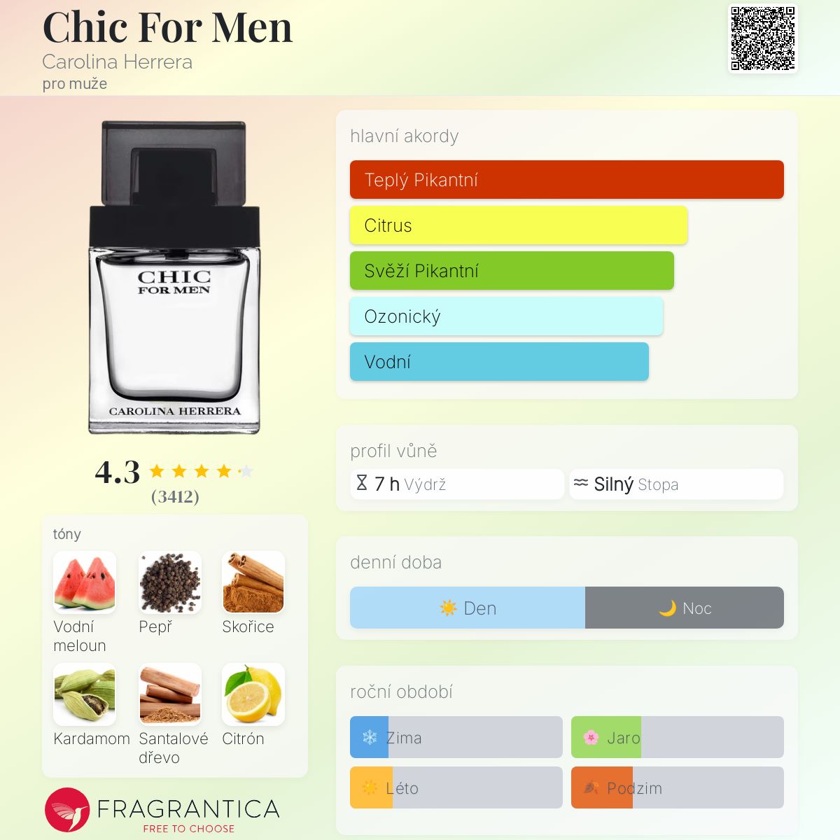 Chic For Men podle Carolina Herrera je Woody Spicy vůně pro muže. Chic For Men byl/a uveden/a v roce 2003. Chic For Men byl/a vytvořen/a Carlos Benaïm, Rosendo Mateu a Jean-Marc Chaillan. Vrchní tóny jsou Vodní meloun, Kardamom, Citrón, Bergamot a Mandarinka; střední tóny jsouPepř a Skořice ; základní tóny jsou Santalové dřevo, Pižmo, Fazole tonka, Jantar (ambra) a Cedr.
