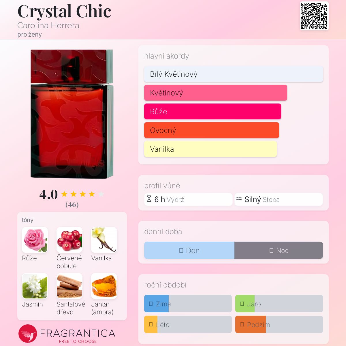 Crystal Chic podle Carolina Herrera je Orientální Floral vůně pro ženy. Crystal Chic byl/a uveden/a v roce 2004. Vrchní tóny jsou Bulharská růže, Červené bobule a Červená frézie; střední tóny jsouJasmín, Pomerančový květ, Jamajský pepř a Indická tuberóza ; základní tóny jsou Bourbonská vanilka, Santalové dřevo, Jantar (ambra) a Ambrette (přírodní pižmo).