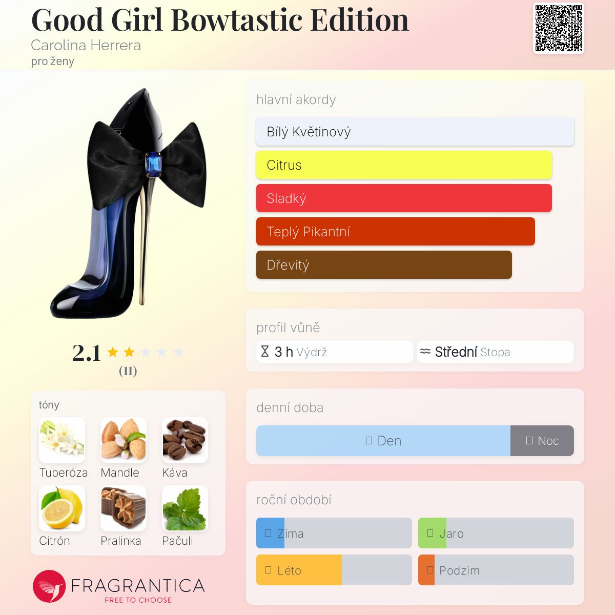 Good Girl Bowtastic Edition podle Carolina Herrera je Floral Fruity Gourmand vůně pro ženy. Toto je nová vůně. Good Girl Bowtastic Edition byl/a uveden/a v roce 2025. "Nosem" za touto vůní je Louise Turner. Vrchní tóny jsou Mandle, Káva, Citrón a Bergamot; střední tóny jsouTuberóza, Pralinka, Pomerančový květ, Jasmín Sambac, Bulharská růže a Skořice ; základní tóny jsou Pačuli, Fazole tonka, Kakao, Kašmír, Cedr, Santalové dřevo, Jantar (ambra) a Pižmo.