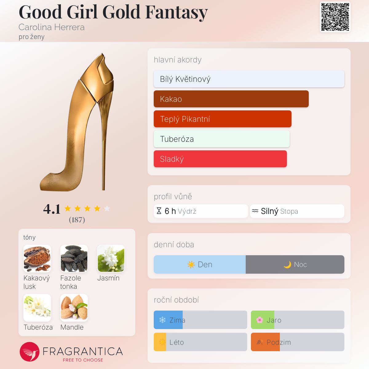 Good Girl Gold Fantasy podle Carolina Herrera je Orientální Floral vůně pro ženy. Toto je nová vůně. Good Girl Gold Fantasy byl/a uveden/a v roce 2022. "Nosem" za touto vůní je Louise Turner. Vrchní tón je Mandle ; střední tóny jsouJasmín Sambac a Tuberóza ; základní tóny jsou Kakao a Fazole tonka.