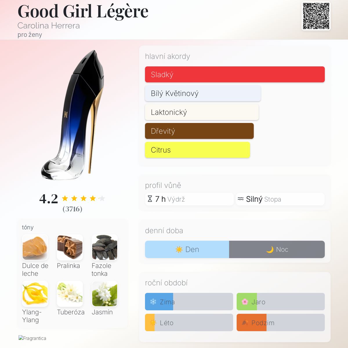 Prodávají ji jako letní/jarní verzi své předchůdkyně, ale když si k ní přivoním a vidím tóny, tak se tato vůně hodí spíše na podzim/zimu než na jaro/léto, protože je to sladká vůně.