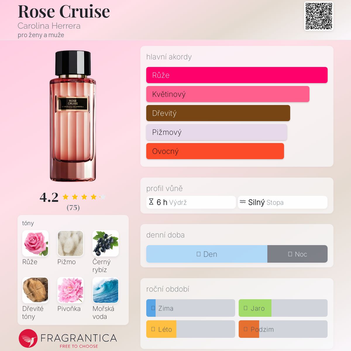 Rose Cruise podle Carolina Herrera je Floral vůně pro ženy a muže. Rose Cruise byl/a uveden/a v roce 2017. Vrchní tóny jsou Růže a Černý rybíz; střední tóny jsouBulharská růže a Pivoňka ; základní tóny jsou Bílé pižmo a Dřevité tóny.