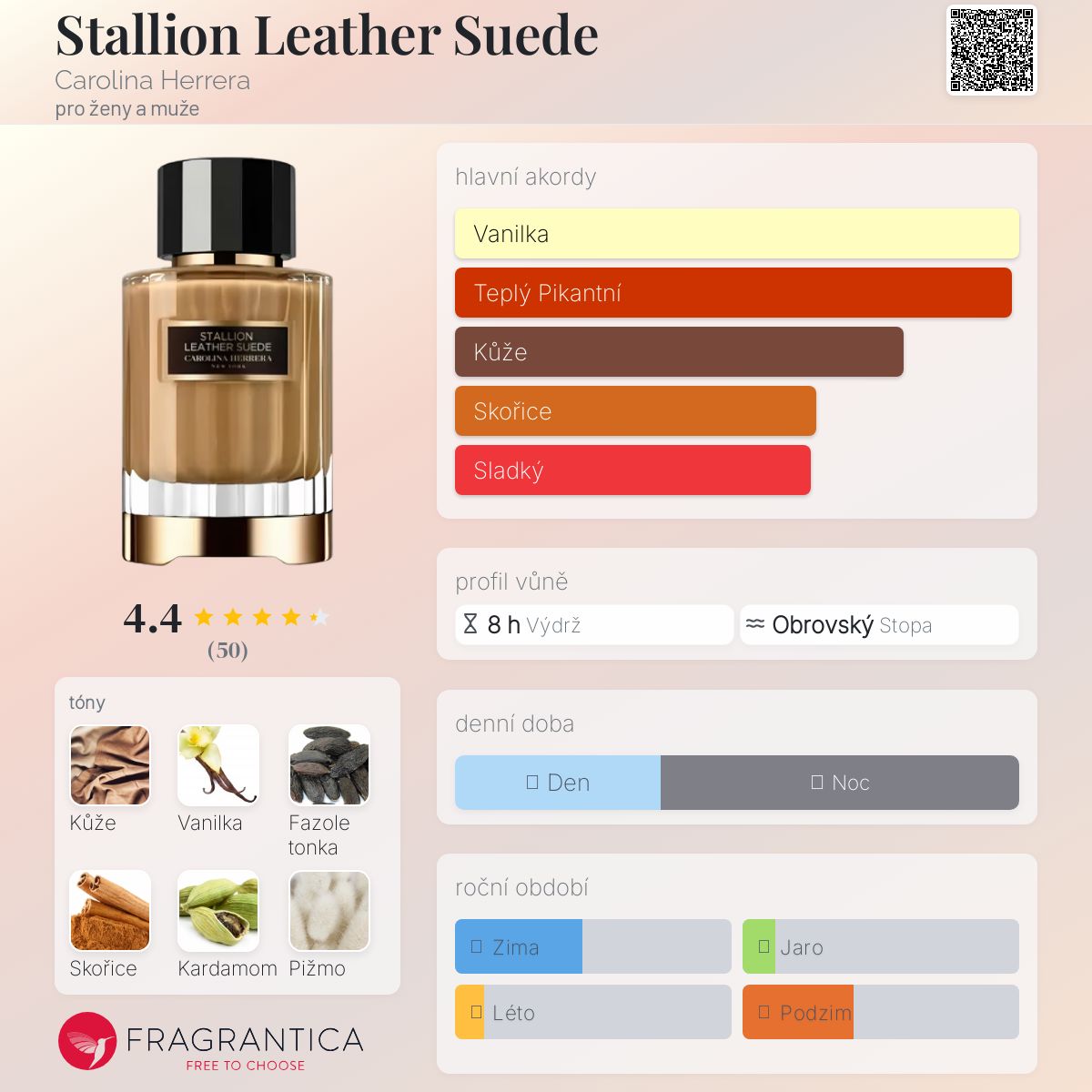 Stallion Leather Suede podle Carolina Herrera je Leather vůně pro ženy a muže. Toto je nová vůně. Stallion Leather Suede byl/a uveden/a v roce 2025. "Nosem" za touto vůní je Jordi Fernández. Vrchní tón je Kůže ; střední tóny jsouSkořice, Kardamom a Hřebíček ; základní tóny jsou Vanilka, Fazole tonka a Pižmo.