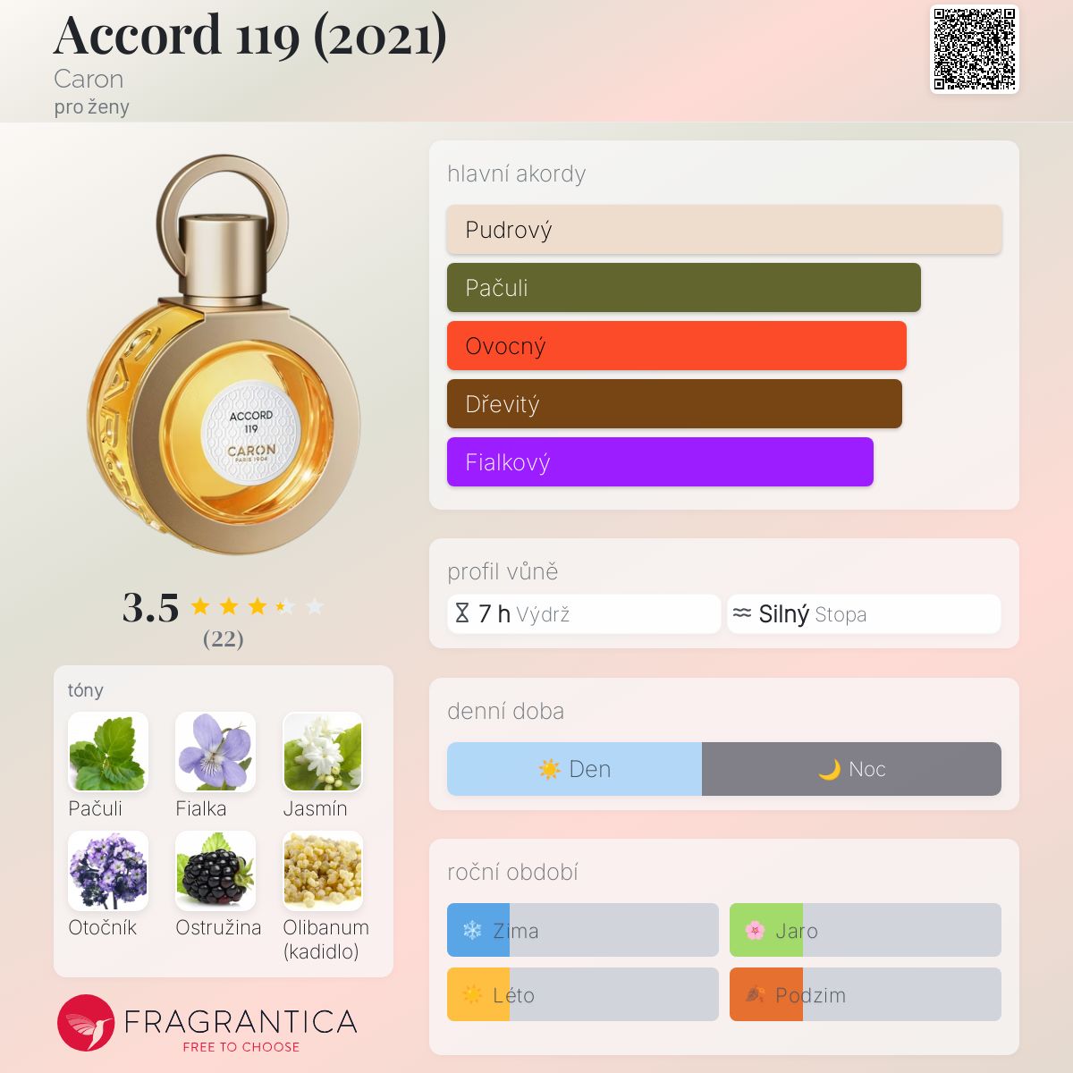 Accord 119 (2021) podle Caron je Chypre Fruity vůně pro ženy. Accord 119 (2021) byl/a uveden/a v roce 2021. "Nosem" za touto vůní je Jean Jacques. Vrchní tóny jsou Fialka, Ostružina a Černý rybíz; střední tóny jsouEgyptský jasmín a Otočník ; základní tóny jsou Pačuli, Olibanum, Pižmo a Vanilka.