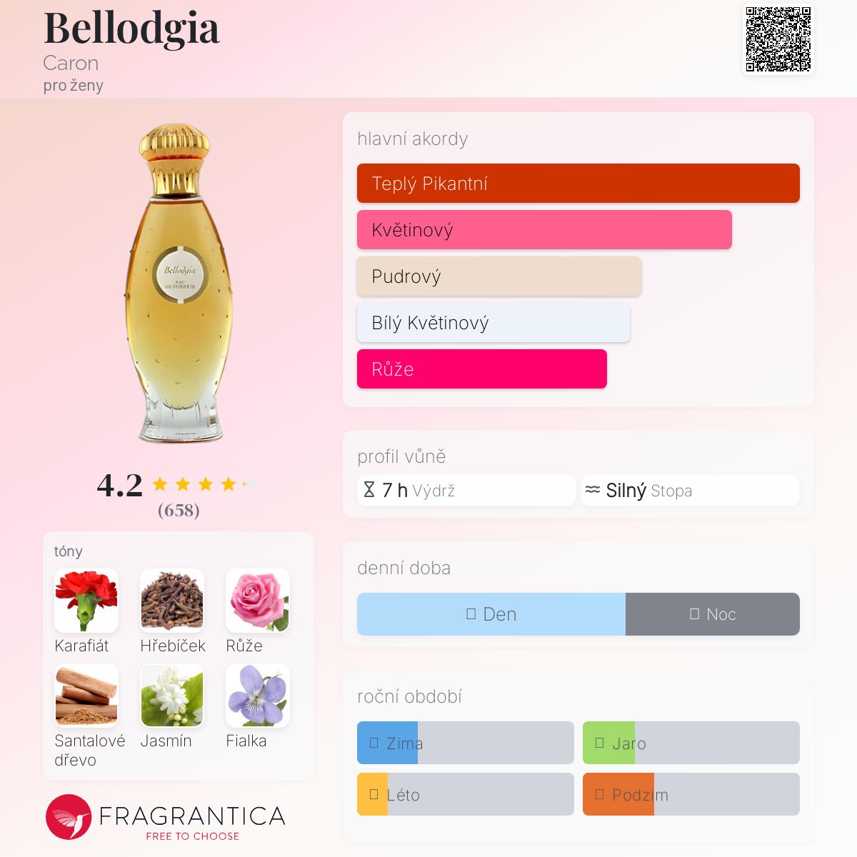 Bellodgia podle Caron je Floral vůně pro ženy. Bellodgia byl/a uveden/a v roce 1927. "Nosem" za touto vůní je Ernest Daltroff. Vrchní tóny jsou Karafiát a Růže; střední tóny jsouJasmín, Fialka a Konvalinka ; základní tóny jsou Hřebíček, Santalové dřevo, Vanilka a Pižmo.