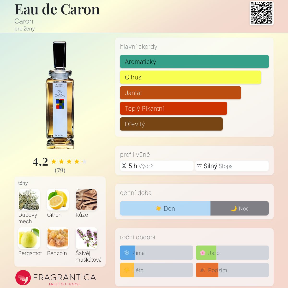 Eau de Caron podle Caron je Chypre vůně pro ženy. Eau de Caron byl/a uveden/a v roce 1980. "Nosem" za touto vůní je Gerard Lefort. Vrchní tóny jsou Citrón, Bergamot, Šalvěj muškátová, Aldehydy, Bazalka a Mandarinka; střední tóny jsouTymián, Karafiát, Cedr, Jasmín, Pomerančový květ a Orchidej ; základní tóny jsou Dubový mech, Kůže, Benzoin, Myrha, Pačuli, Vanilka a Jantar (ambra).