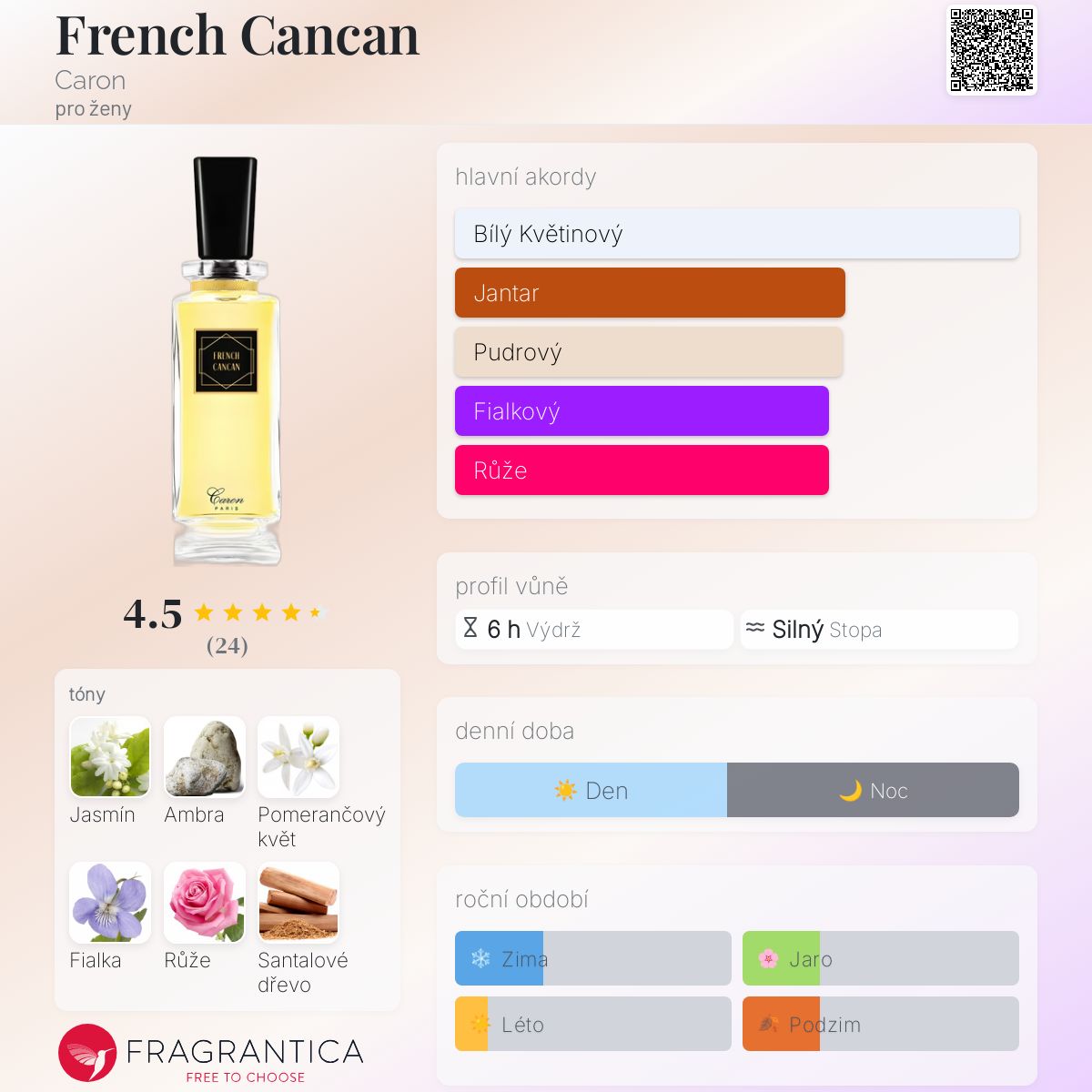 French Cancan podle Caron je Floral vůně pro ženy. French Cancan byl/a uveden/a v roce 2018. "Nosem" za touto vůní je Ernest Daltroff. Vrchní tóny jsou Jasmín a Fialka; střední tóny jsouPomerančový květ a Růže májová ; základní tóny jsou Ambra a Santalové dřevo.