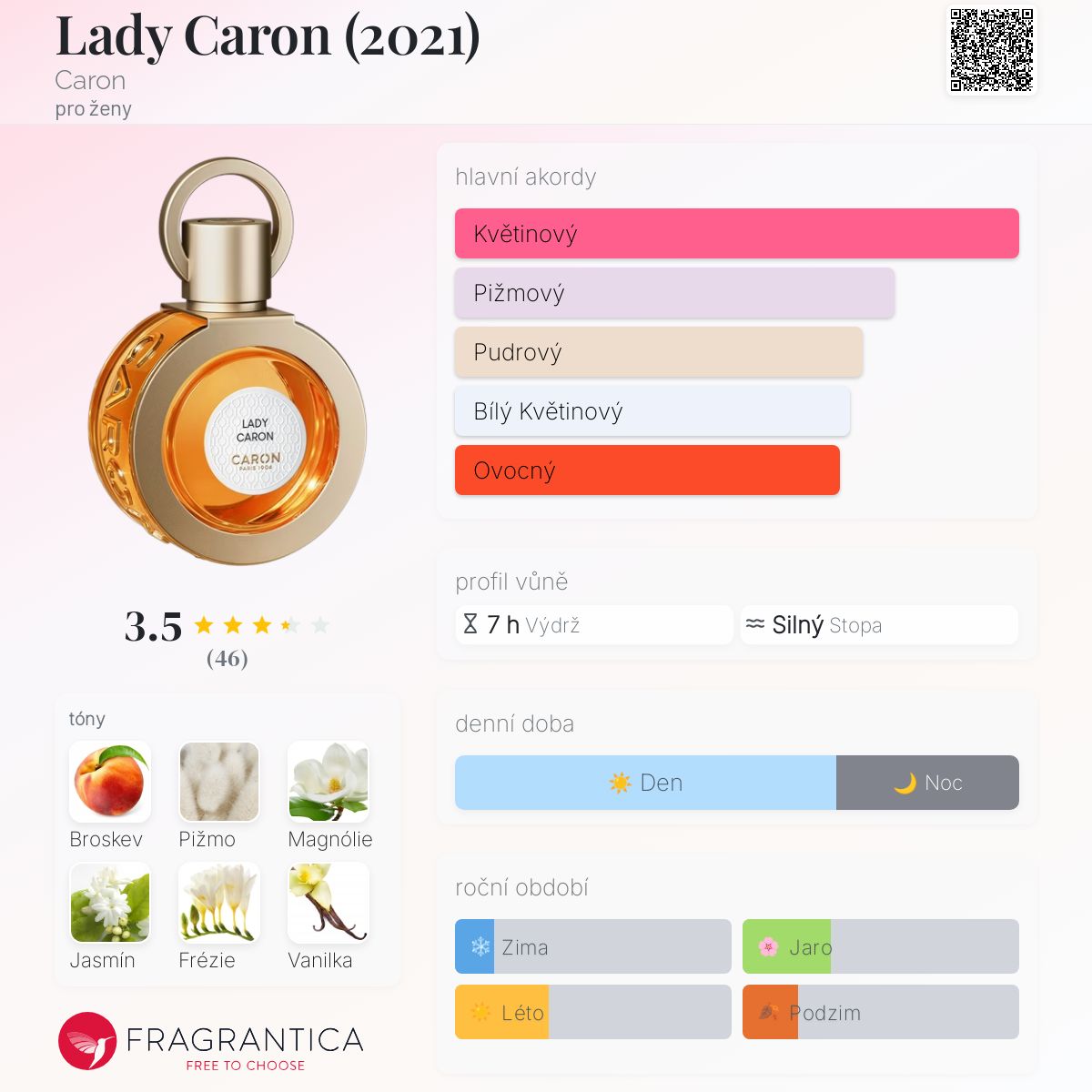 Lady Caron (2021) podle Caron je Orientální Floral vůně pro ženy. Lady Caron (2021) byl/a uveden/a v roce 2021. "Nosem" za touto vůní je Jean Jacques. Vrchní tóny jsou Magnólie, Jasmín, Frézie a Neroli; střední tón jeBroskev ; základní tóny jsou Pižmo a Vanilka.