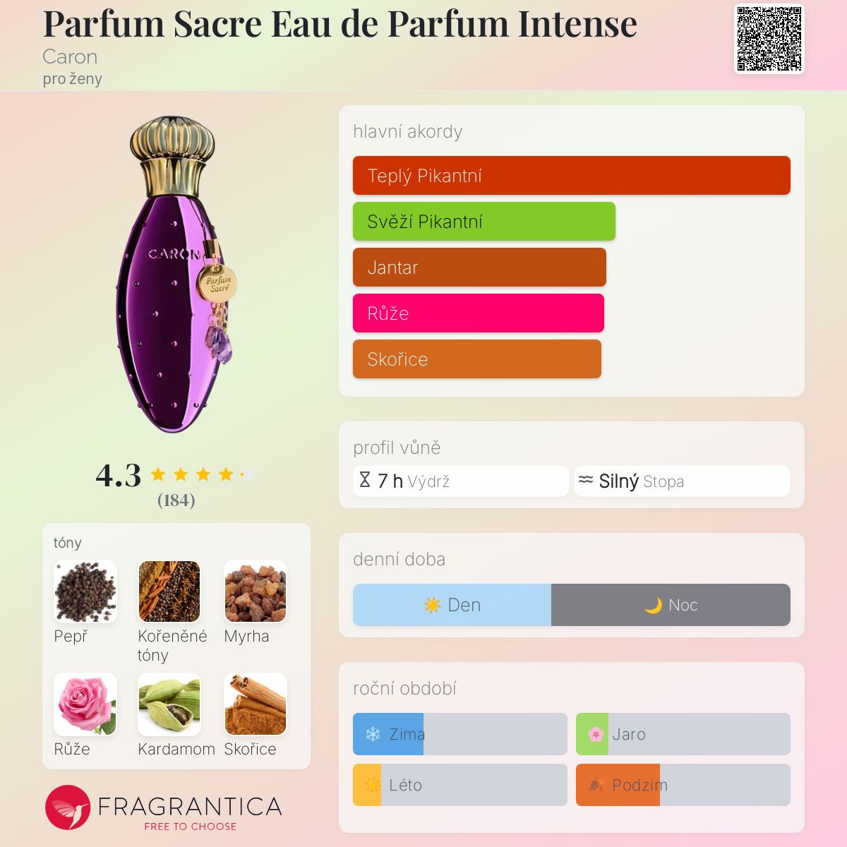 Parfum Sacre Eau de Parfum Intense podle Caron je Orientální Spicy vůně pro ženy. Parfum Sacre Eau de Parfum Intense byl/a uveden/a v roce 2010. Vrchní tóny jsou Pepř, Kardamom a Skořice; střední tóny jsouKoření, Růže a Jasmín ; základní tóny jsou Myrha, Vanilka a Pižmo.
