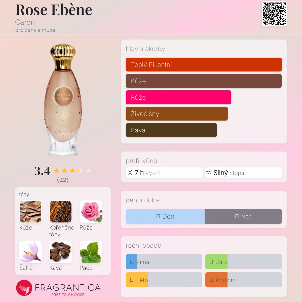 Rose Ebène podle Caron je vůně pro ženy a muže. Rose Ebène byl/a uveden/a v roce 2019. "Nosem" za touto vůní je Jean Jacques. Vrchní tóny jsou Kořeněné tóny a Šafrán; střední tóny jsouDamašská růže a Káva ; základní tóny jsou Kůže a Pačuli.