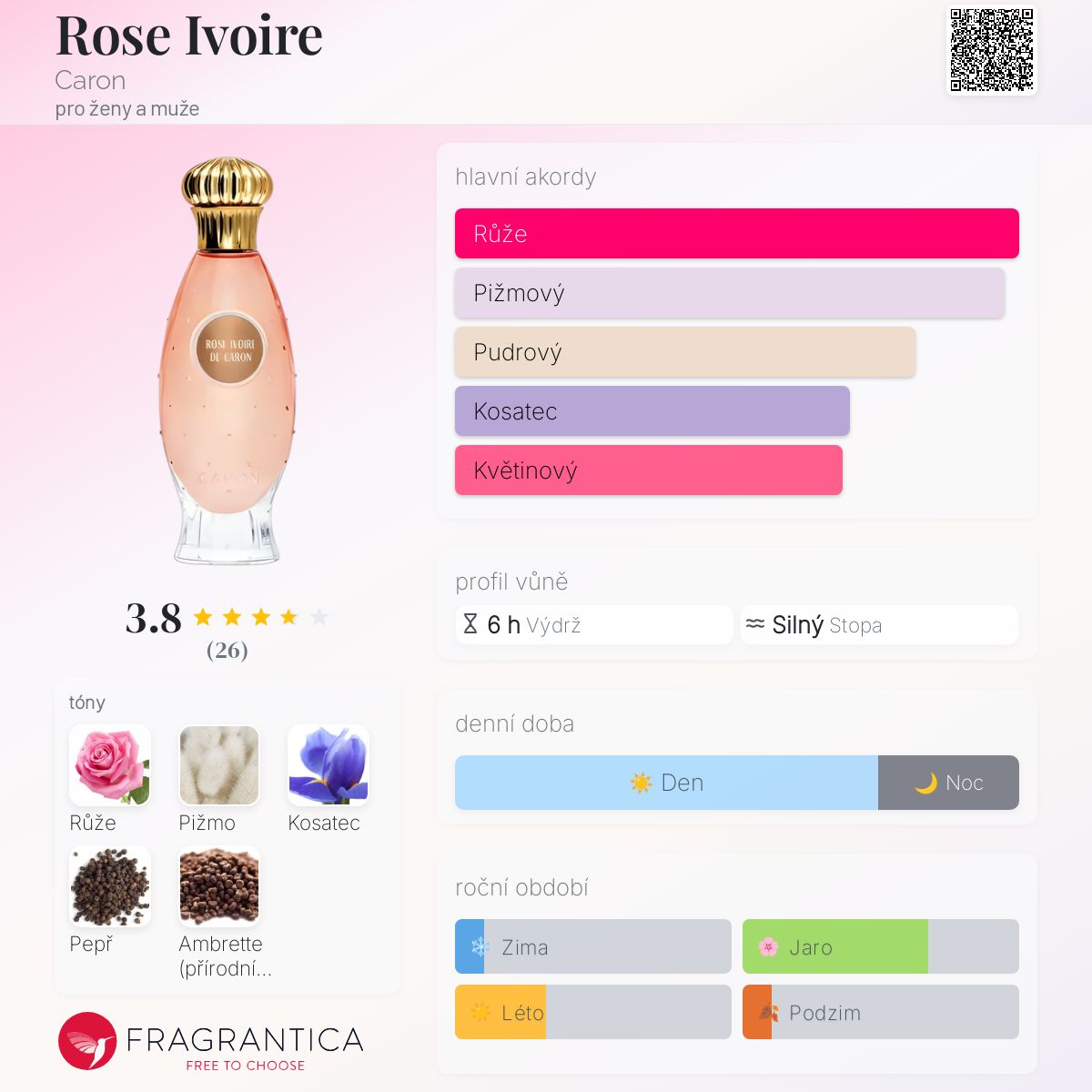 Rose Ivoire podle Caron je vůně pro ženy a muže. Rose Ivoire byl/a uveden/a v roce 2019. "Nosem" za touto vůní je Jean Jacques. Vrchní tón je Bílý pepř ; střední tón jeDamašská růže ; základní tóny jsou Bílé pižmo, Kosatec a Ambrette (přírodní pižmo).