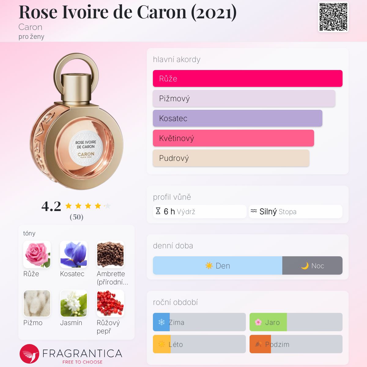 Rose Ivoire de Caron (2021) podle Caron je Floral vůně pro ženy. Rose Ivoire de Caron (2021) byl/a uveden/a v roce 2021. "Nosem" za touto vůní je Jean Jacques. Vrchní tóny jsou Růžový pepř, Bílý pepř a Černý pepř; střední tóny jsouDamašská růže a Indický jasmín ; základní tóny jsou Kosatec, Ambrette (přírodní pižmo) a Bílé pižmo.