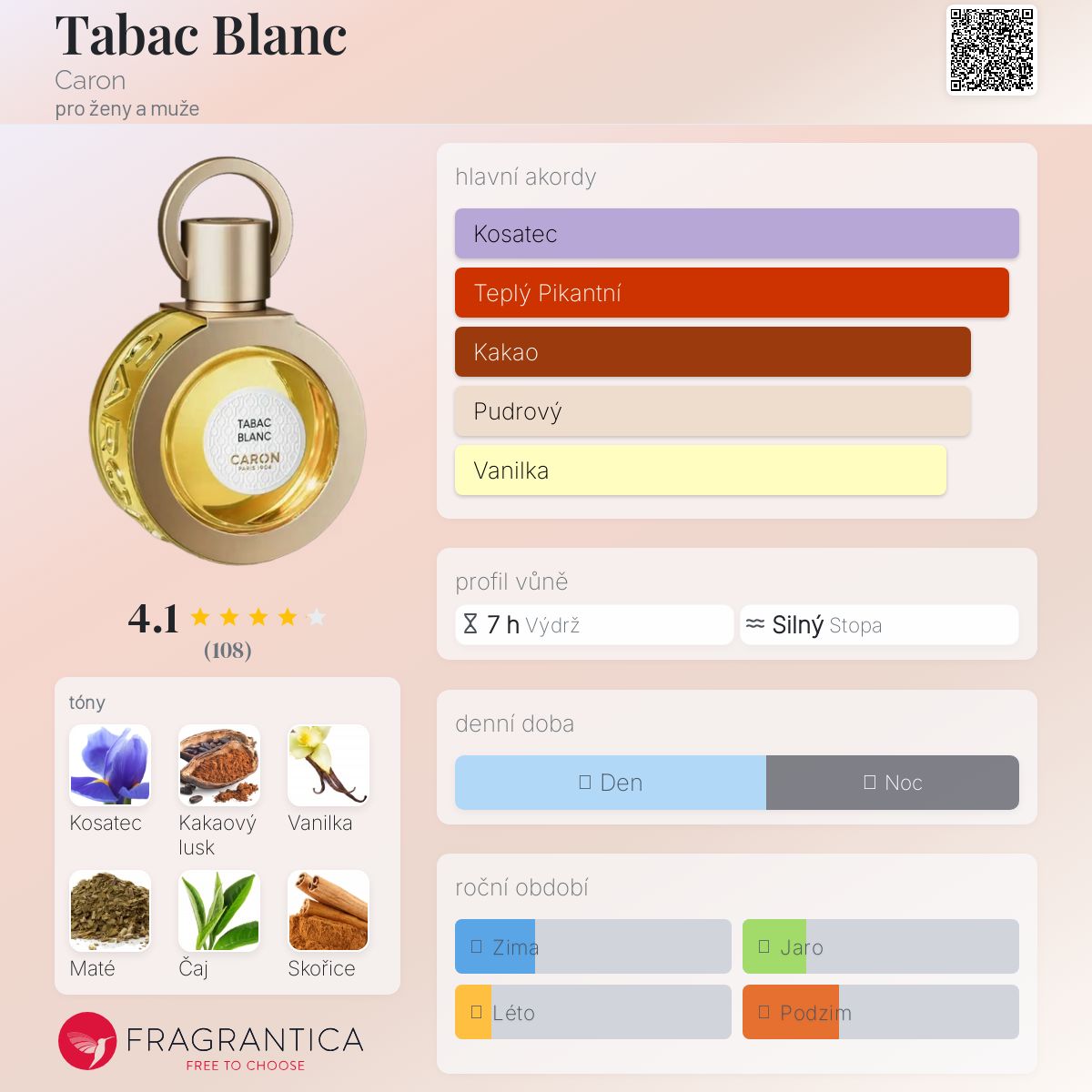 Tabac Blanc podle Caron je Aromatic vůně pro ženy a muže. Tabac Blanc byl/a uveden/a v roce 2022. "Nosem" za touto vůní je Jean Jacques. Vrchní tóny jsou Maté, Bílý čaj a Bergamot; střední tóny jsouKosatec a Jasmín ; základní tóny jsou Kakaový lusk, Vanilka a Skořice.
