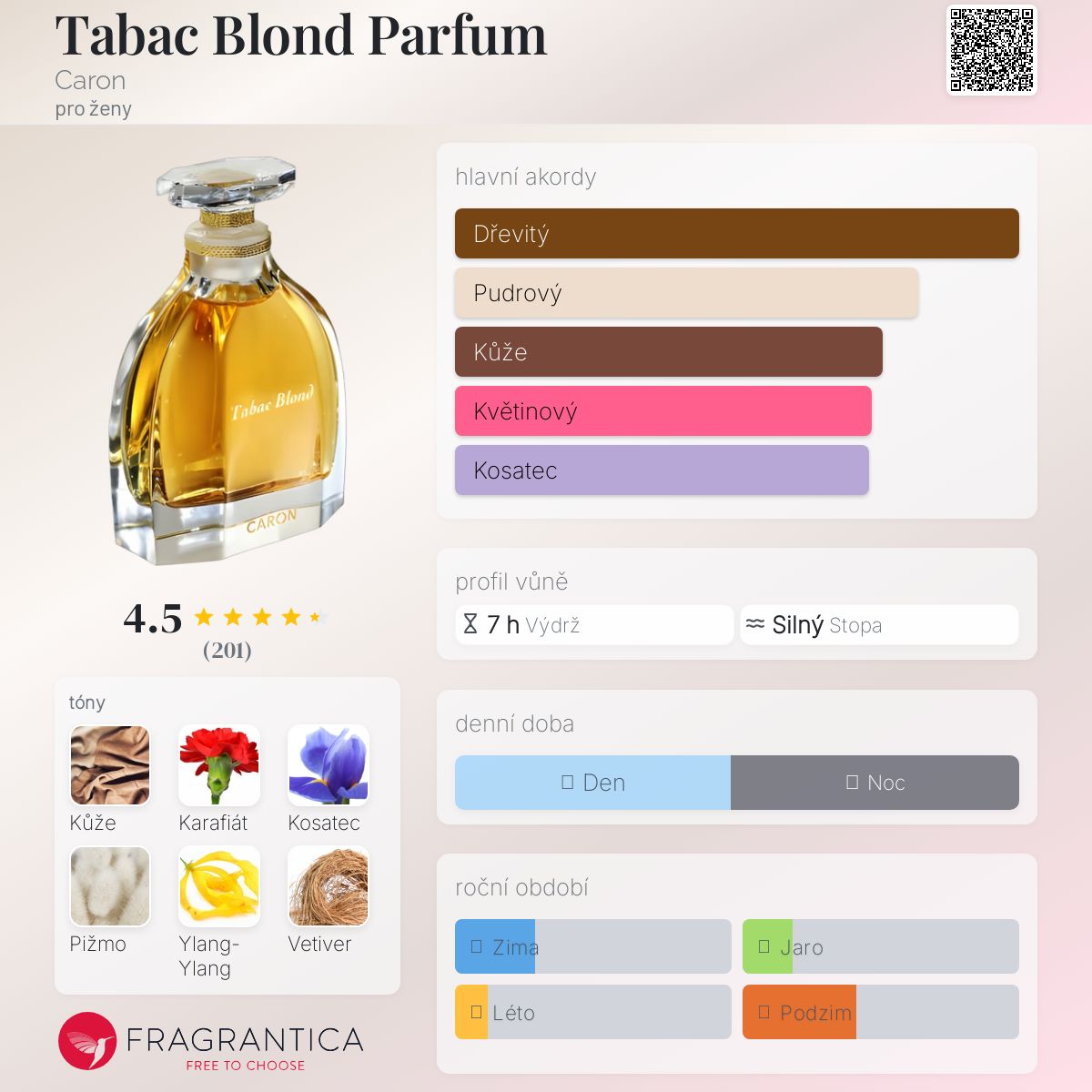 Tabac Blond Parfum podle Caron je vůně pro ženy. Tabac Blond Parfum byl/a uveden/a v roce 1919. "Nosem" za touto vůní je Ernest Daltroff. Vrchní tóny jsou Kůže, Karafiát a Limetka; střední tóny jsouKosatec, Ylang-Ylang a Vetiver ; základní tóny jsou Pižmo, Vanilka, Cedr a Pačuli.