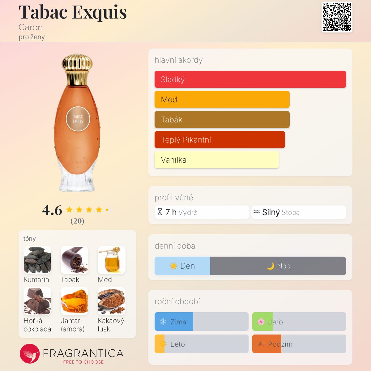 Tabac Exquis podle Caron je Floral Woody Musk vůně pro ženy. Tabac Exquis byl/a uveden/a v roce 2020. "Nosem" za touto vůní je Jean Jacques.