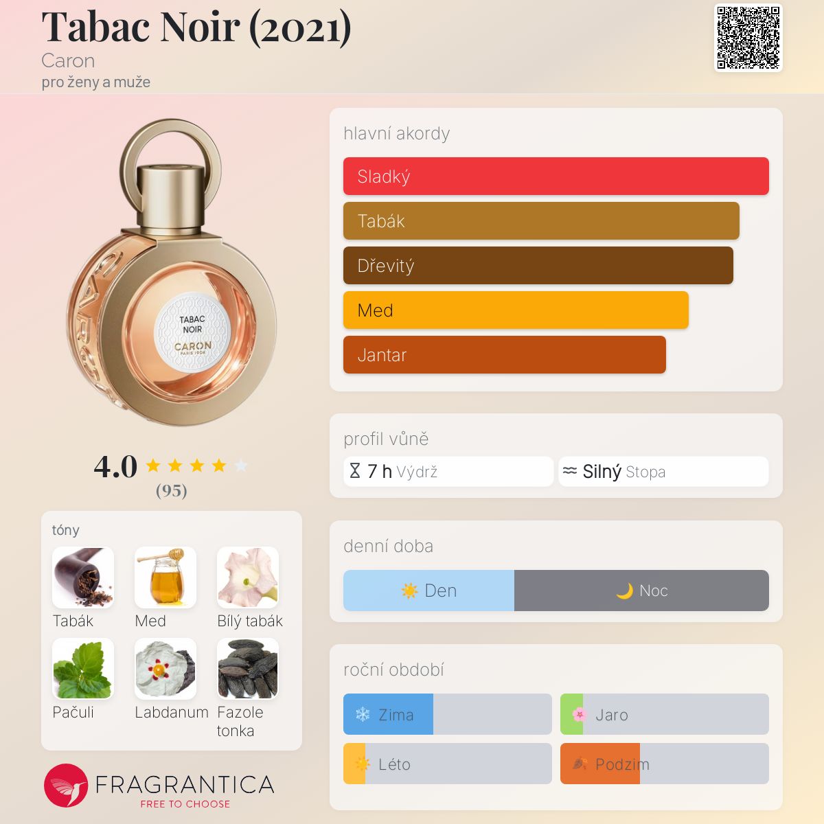 Tabac Noir (2021) podle Caron je Woody Aromatic vůně pro ženy a muže. Tabac Noir (2021) byl/a uveden/a v roce 2021. "Nosem" za touto vůní je Jean Jacques. Vrchní tóny jsou Bulharský světlý tabák a Madagaskarský pepř; střední tóny jsouTabák, Labdanum, List indonéského pačuli a Papyrus ; základní tóny jsou Med, Fazole tonka, Cedr a Vanilka.