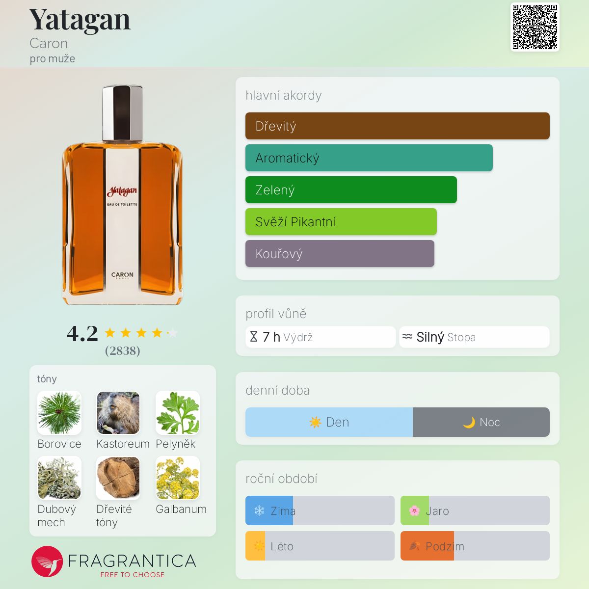 Yatagan podle Caron je Aromatic Green vůně pro muže. Yatagan byl/a uveden/a v roce 1978. "Nosem" za touto vůní je Vincent Marcello. Vrchní tóny jsou Borovice, Galbanum, Bazalka, Řeřicha, Levandule a Máta; střední tóny jsouPelyněk, Dubový mech, Dub a Pačuli ; základní tóny jsou Kastoreum, Dřevité tóny, Kadidlo a Pižmo.