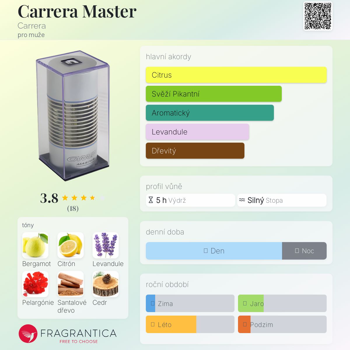 Carrera Master podle Carrera je Aromatic Spicy vůně pro muže. Carrera Master byl/a uveden/a v roce 2005. Vrchní tóny jsou Bergamot, Citrón a Eukalyptus; střední tóny jsouLevandule, Pelargónie a Skořice ; základní tóny jsou Santalové dřevo, Cedr a Pižmo.
