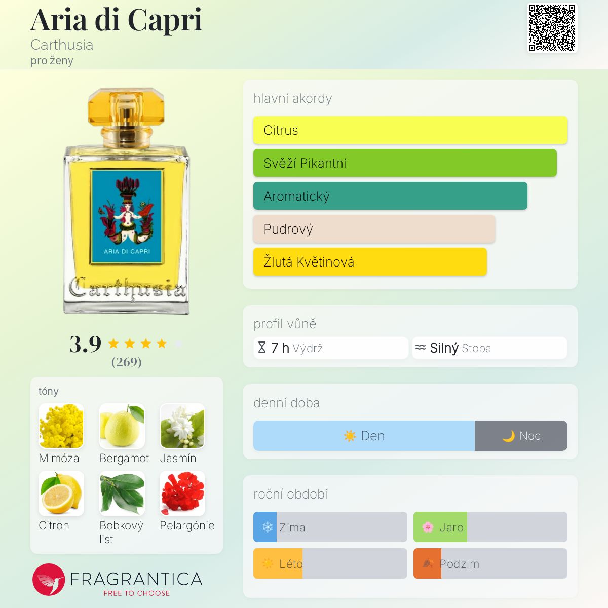 Aria di Capri podle Carthusia je Floral Aldehyde vůně pro ženy. Aria di Capri byl/a uveden/a v roce 2003. Vrchní tóny jsou Bergamot, Citrón a Petitgrain; střední tóny jsouMimóza, Jasmín, Pelargónie a Růže ; základní tóny jsou Bobkový list, Pižmo a Cedr.