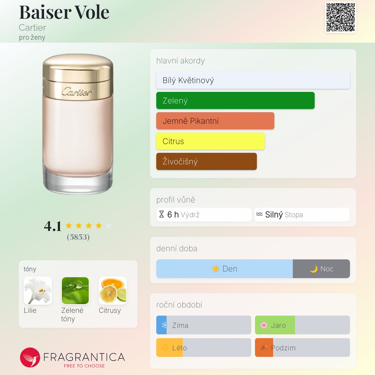 Baiser Vole podle Cartier je Floral vůně pro ženy. Baiser Vole byl/a uveden/a v roce 2011. "Nosem" za touto vůní je Mathilde Laurent. Vrchní tóny jsou Lilie a Citrusy; střední tón jeLilie ; základní tóny jsou Zelená lilie a Zelené tóny.