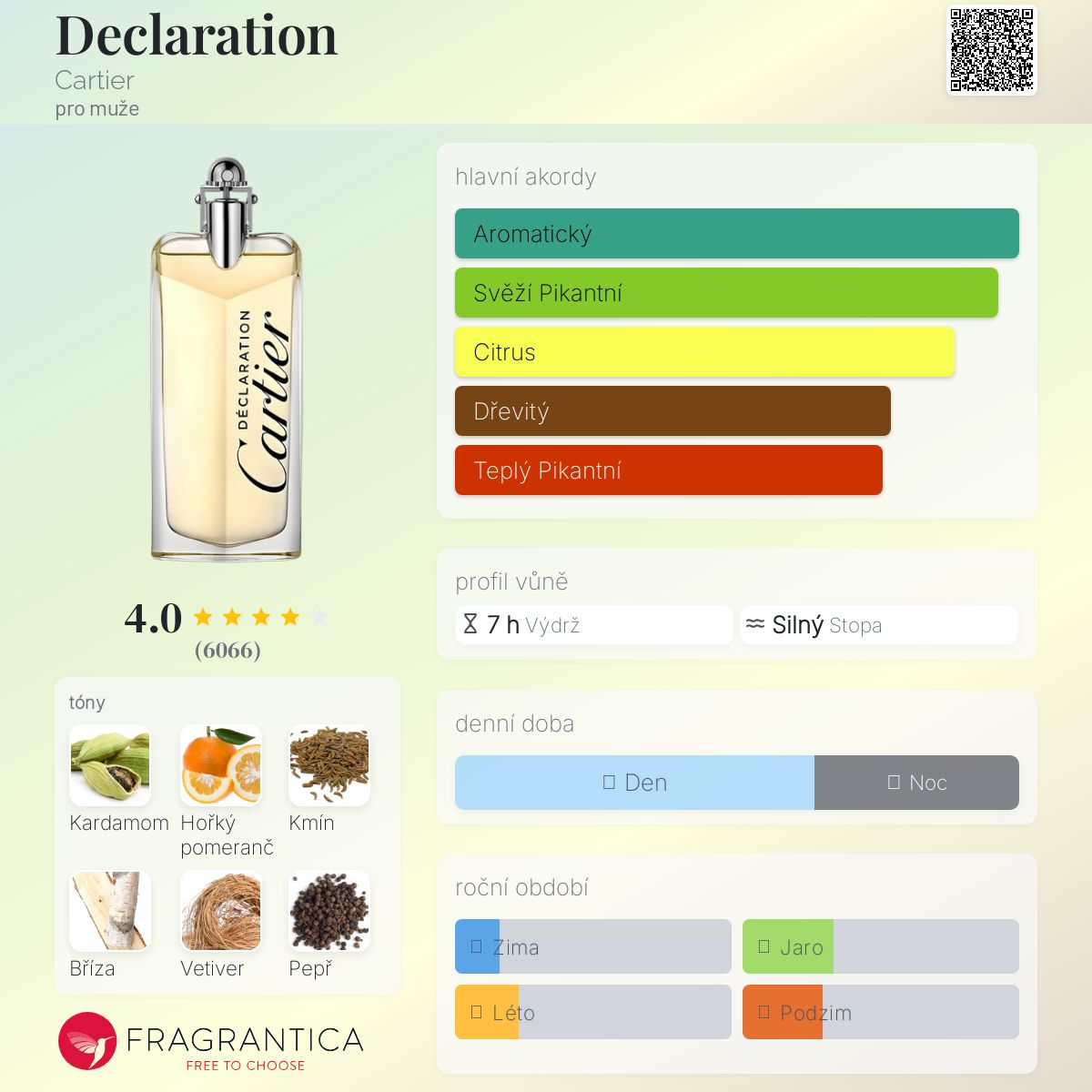 Declaration podle Cartier je Woody Floral Musk vůně pro muže. Declaration byl/a uveden/a v roce 1998. "Nosem" za touto vůní je Jean-Claude Ellena. Vrchní tóny jsou Hořký pomeranč, Kmín, Bříza, Bergamot, Koriandr, Mandarinka, Neroli a Pelyněk; střední tóny jsouGuatemalský kardamom, Pepř, Zázvor, Kosatec, Jalovec, Skořice, Kořen orris a Jasmín ; základní tóny jsou Tahitský vetiver, Čaj, Cedr, Kůže, Dubový mech a Jantar (ambra).