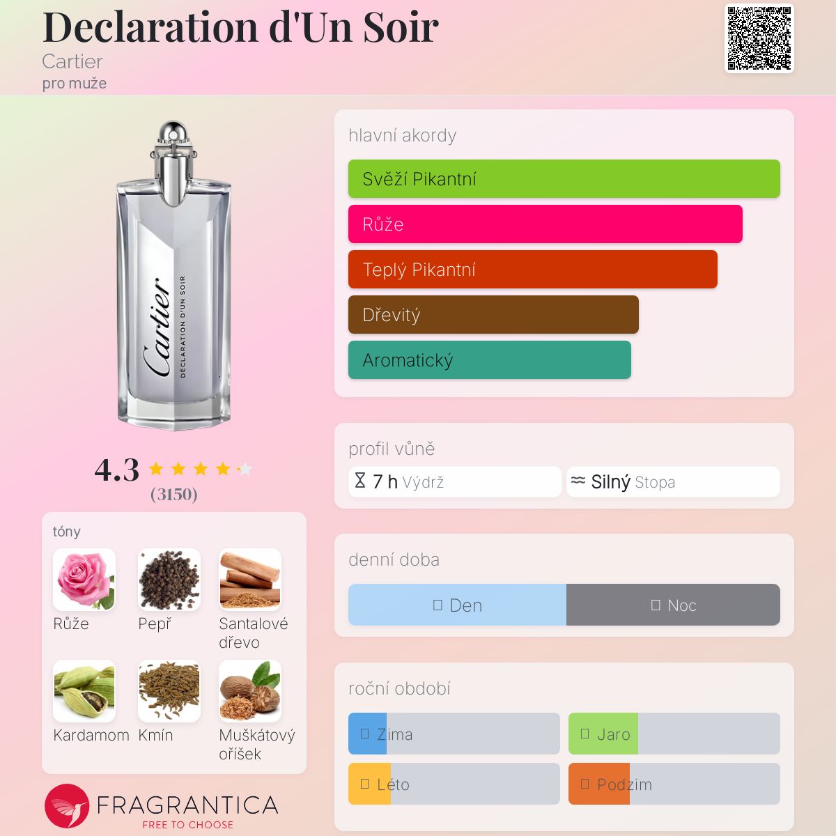 Declaration d'Un Soir podle Cartier je Woody Floral Musk vůně pro muže. Declaration d'Un Soir byl/a uveden/a v roce 2012. "Nosem" za touto vůní je Mathilde Laurent. Vrchní tóny jsou Černý pepř, Kardamom a Kmín; střední tóny jsouRůže a Muškátový oříšek ; základní tón je Santalové dřevo.