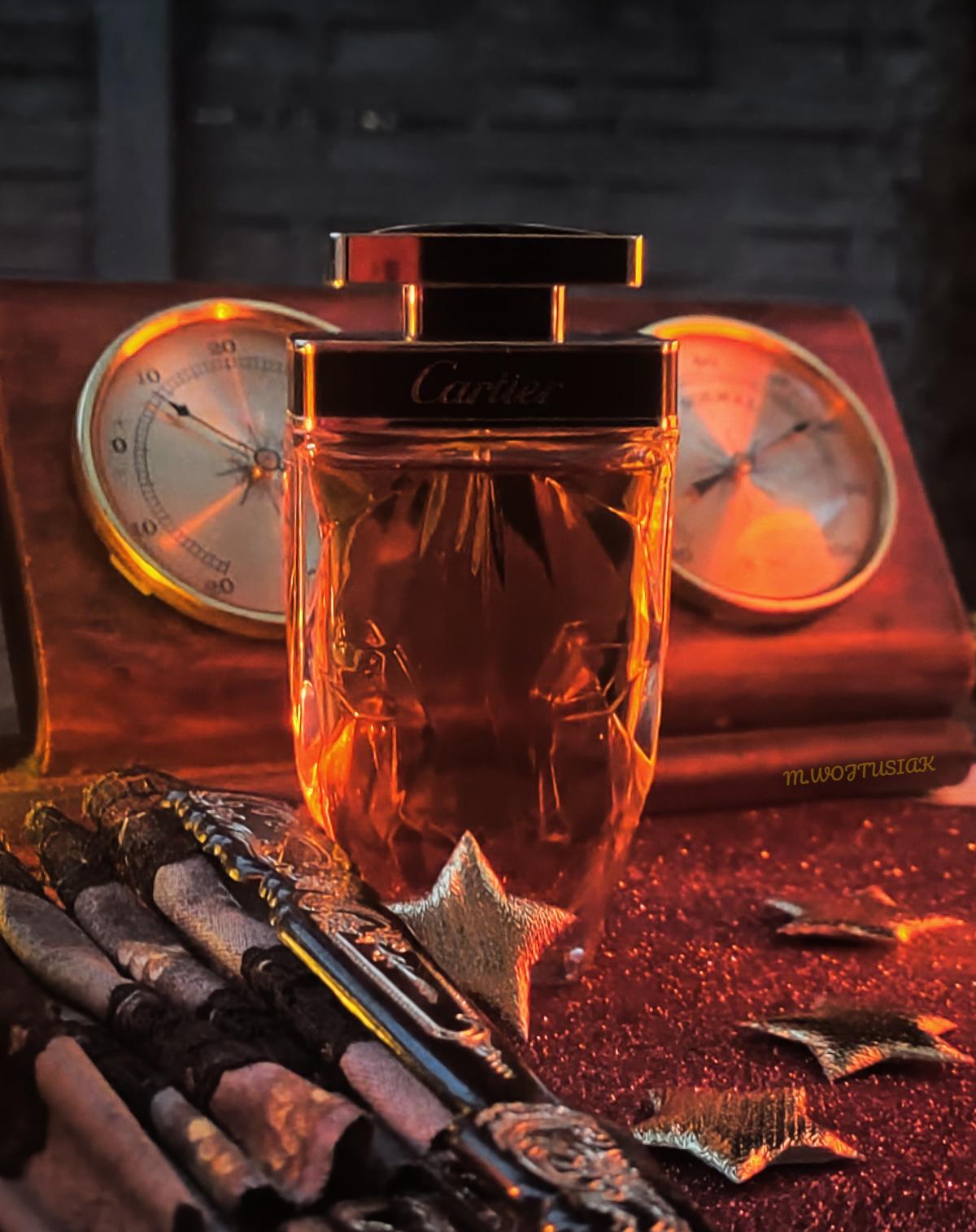 Je to po vzoru Coco Chanel, pravda, ale je to kulatější, kulatost, která je haute parfumery a rozhodně ne komerční, a především se obejde bez té zatuchlé, nepříjemné kořenitosti. Také se obejde bez onoho typického rebarborového a jahodového úvodu klasické la panthere a soustředí se na starou školu sušené meruňky/broskve, která tolik připomíná Femme Rochas nebo Mitsouko. Pak přechází přímo k jádru věci s krásnou částí la panthere, kterou je zejména živočišné pižmo, dubový mech a akordy gardénie, to vše v plnějším a méně zvlhčeném vyznění než mateřská vůně, ale spíše sušší a kovovější, s jasnými tóny sušeného ovoce (makadamové ořechy, lískové oříšky, pražené mandle atd.).