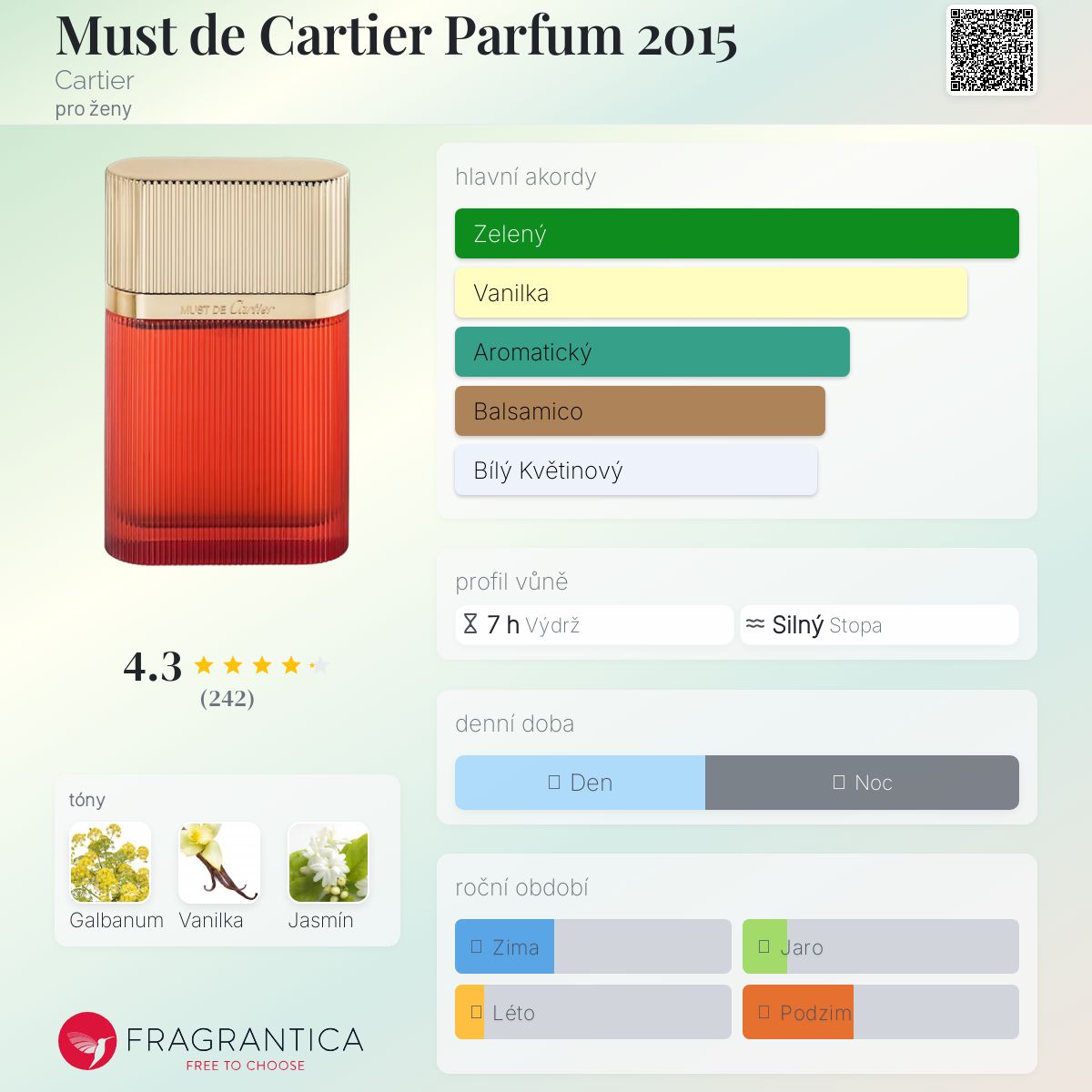 Must de Cartier Parfum 2015 podle Cartier je Orientální Floral vůně pro ženy. Must de Cartier Parfum 2015 byl/a uveden/a v roce 2015. Vrchní tón je Jasmín ; střední tón jeGalbanum ; základní tón je Vanilka.