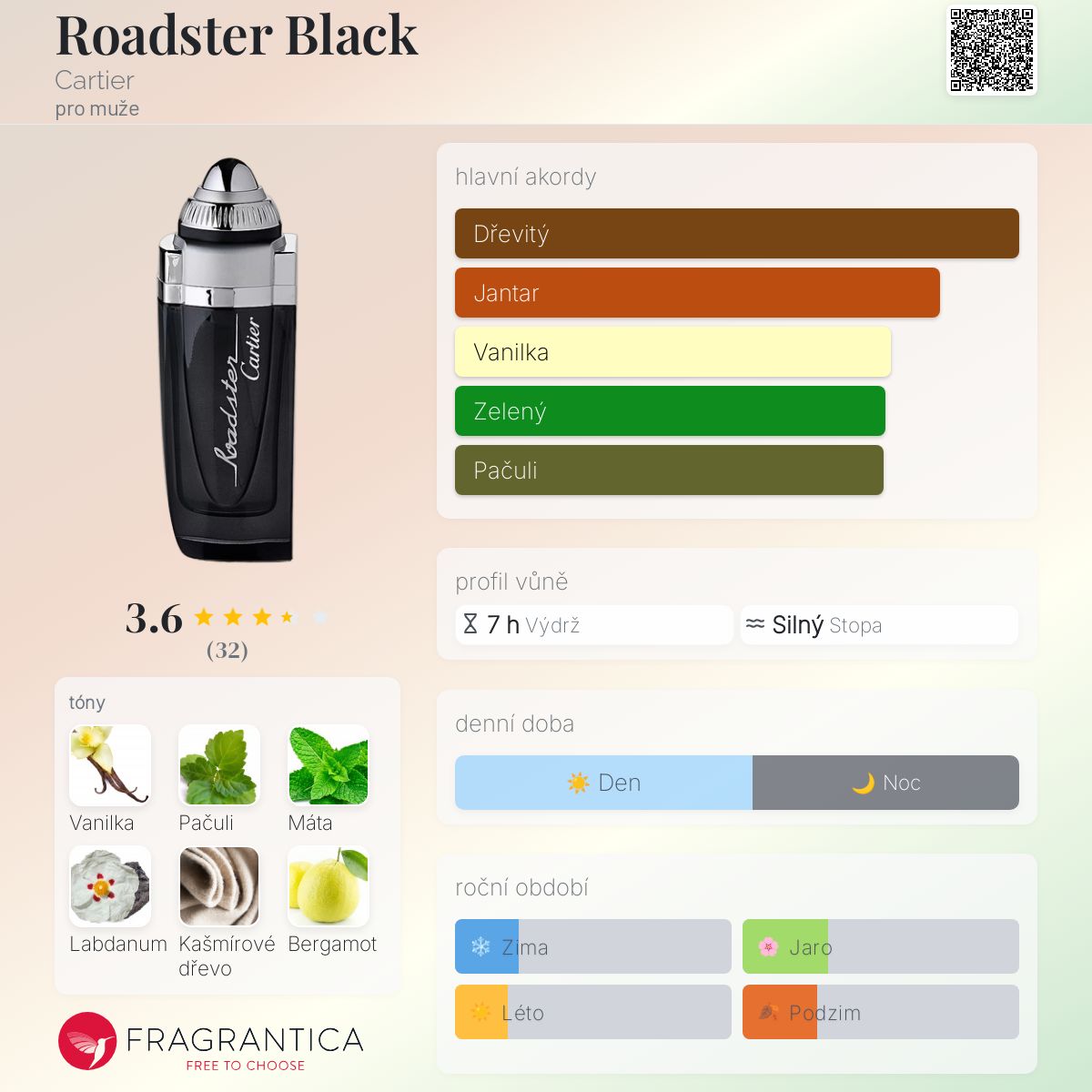 Roadster Black podle Cartier je vůně pro muže. Roadster Black byl/a uveden/a v roce 2010. Vrchní tóny jsou Máta a Bergamot; základní tóny jsou Vanilka, Pačuli, Francouzské labdanum a Kašmírové dřevo.
