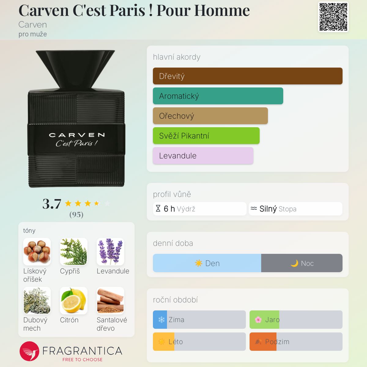Carven C'est Paris ! Pour Homme podle Carven je Woody Aromatic vůně pro muže. Carven C'est Paris ! Pour Homme byl/a uveden/a v roce 2021. "Nosem" za touto vůní je Aurélien Guichard. Vrchní tóny jsou Italský cypřiš, Argentinský citron a Rozmarýn; střední tóny jsouLískový oříšek, Levandule a Fialkové listy ; základní tóny jsou Mech, Santalové dřevo, Virginský cedr, Pačuli a Labdanum.