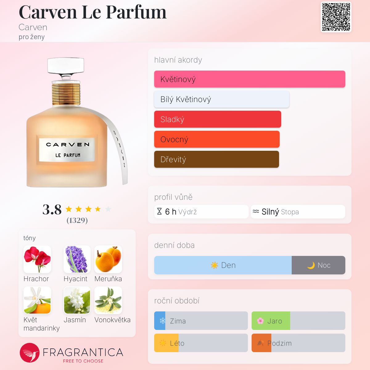 Carven Le Parfum podle Carven je Floral Woody Musk vůně pro ženy. Carven Le Parfum byl/a uveden/a v roce 2013. "Nosem" za touto vůní je Francis Kurkdjian. Vrchní tóny jsou Bílý hyacint, Meruňka a Mandarinkový květ; střední tóny jsouHrachor, Jasmín a Ylang-Ylang ; základní tóny jsou Vonokvětka, List indonéského pačuli a Santalové dřevo.