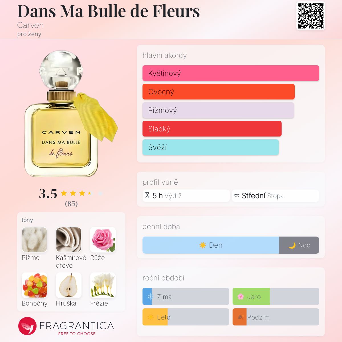 Dans Ma Bulle de Fleurs podle Carven je Floral Fruity vůně pro ženy. Dans Ma Bulle de Fleurs byl/a uveden/a v roce 2020. Vrchní tóny jsou Růže, Hruška, Liči, Zelené jablko a Mandarinka; střední tóny jsouSladké tóny, Frézie, Pivoňka a Lotus ; základní tóny jsou Pižmo, Kašmírové dřevo a Křišťálový jantar.