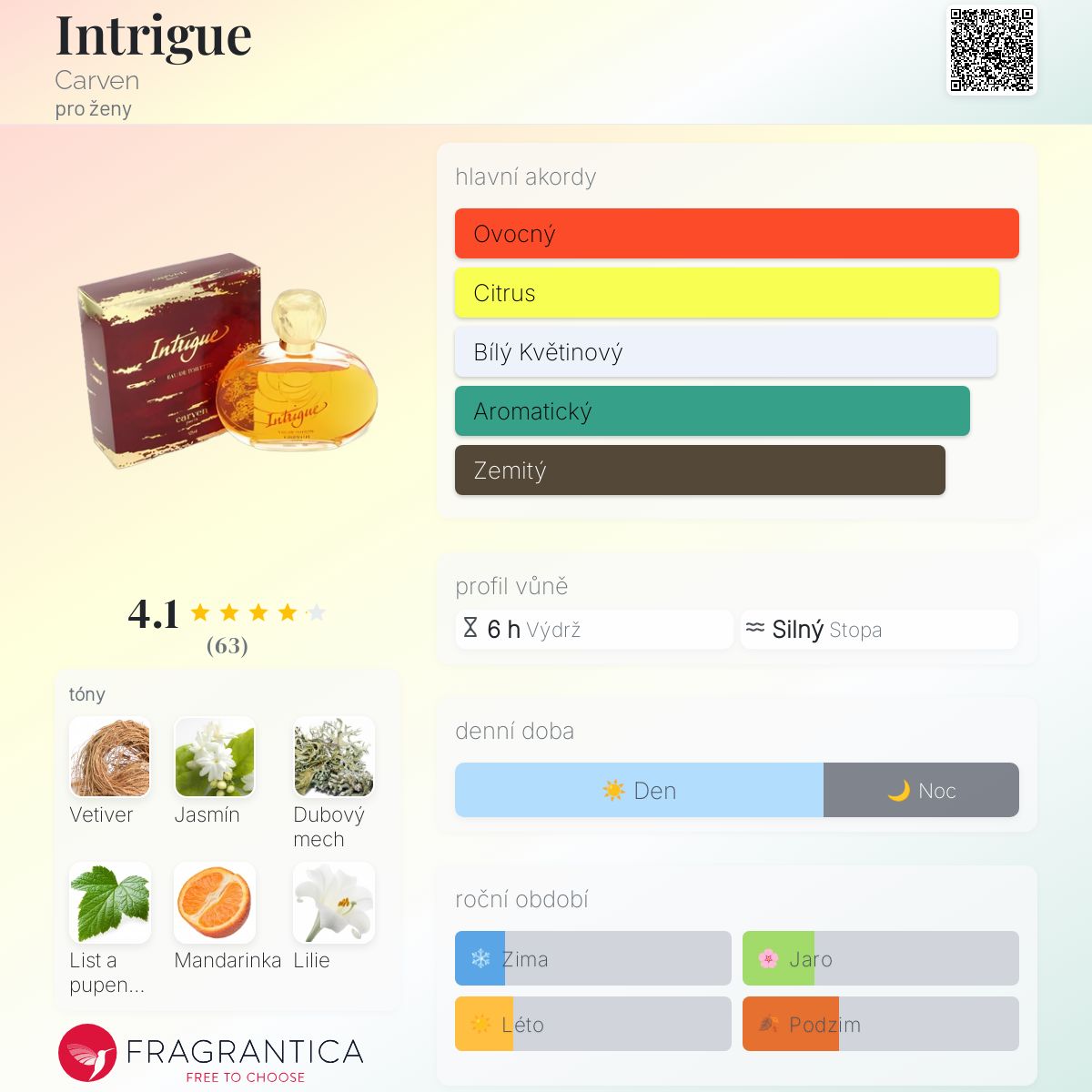 Intrigue podle Carven je Chypre Floral vůně pro ženy. Intrigue byl/a uveden/a v roce 1986. Vrchní tóny jsou Černý rybíz, Mandarinka, Citron amalfi a Bergamot; střední tóny jsouJasmín, Lilie, Švestka, Broskev a Muškátový oříšek ; základní tóny jsou Vetiver, Dubový mech a Vanilka.