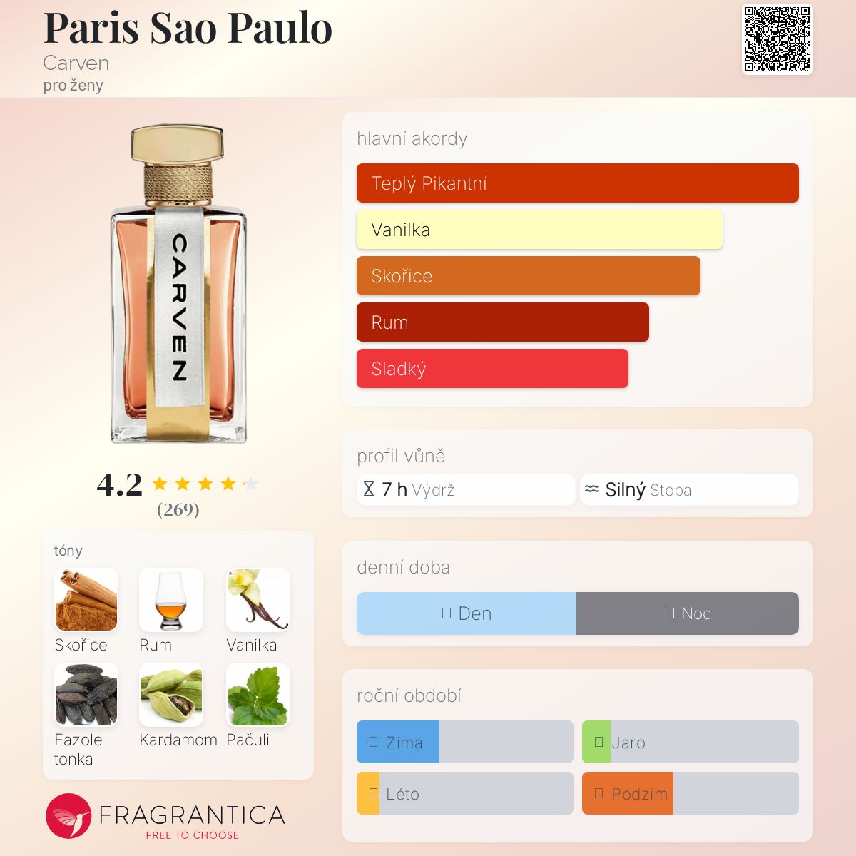 Paris Sao Paulo podle Carven je Orientální Spicy vůně pro ženy. Paris Sao Paulo byl/a uveden/a v roce 2017. Vrchní tóny jsou Skořice, Rum a Bergamot; střední tóny jsouKardamom, Labdanum a Pomerančový květ ; základní tóny jsou Vanilka, Fazole tonka a Pačuli.
